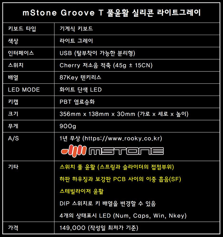 mStone Groove T 풀윤활 키보드의 스펙을 간단히 정리해보았습니다. 앞서 소개한 대로 키보드에 풀 윤활이 되어있다는 부분이 가장 큰 특징인 제품입니다. 분리형 케이블이 적용된 87키 배열의 텐키리스 키보드로 104 풀배열 제품도 있으며 스위치는 리니어 계열(적축, 흑축, 저소음 적축)과 갈축 제품이 있습니다.