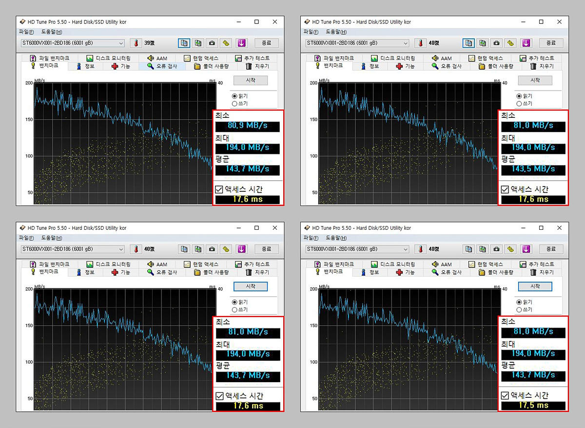 Crystal Disk Mark를 4회 측정한 결괏값의 평균입니다. 매번 SSD만 체크하다가 HDD의 수치를 보니 조금은 새롭더군요. 스펙의 최대 전송 속도인 185MB/s와 거의 차이가 나지 않는 속도를 보여주었습니다.