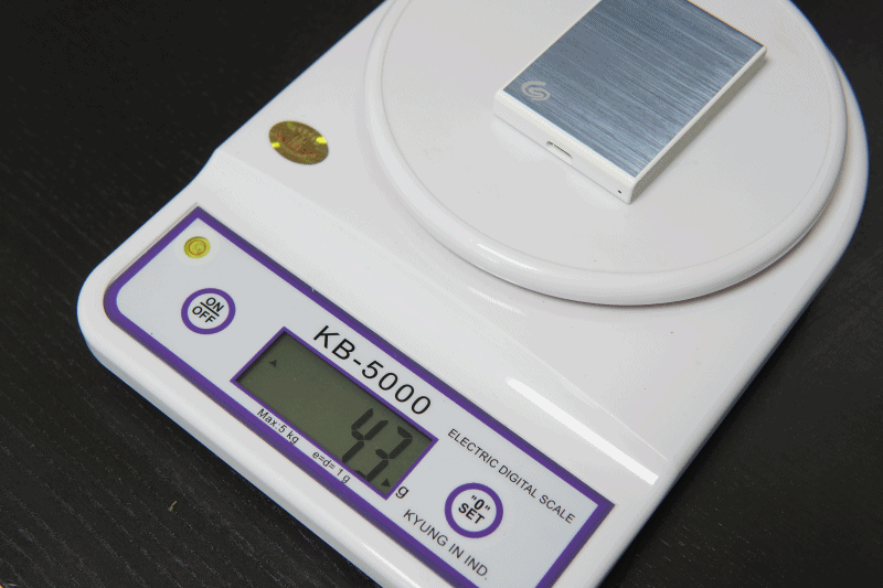 측정을 해보니 SSD는 43g으로 측정이 되었으며 케이블에 따라 2g 정도의 차이가 있었습니다. 제품 DB에는 74g으로 되어있는데 이 무게는 SSD와 케이블 두 개를 모두 합친 무게라 생각합니다. 스마트폰을 기준으로 1/3도 안 되는 크기와 무게를 가지고 있어서 휴대할 때도 부담이 거의 없습니다. 외장 SSD가 가지는 장점 중에 하나죠.
