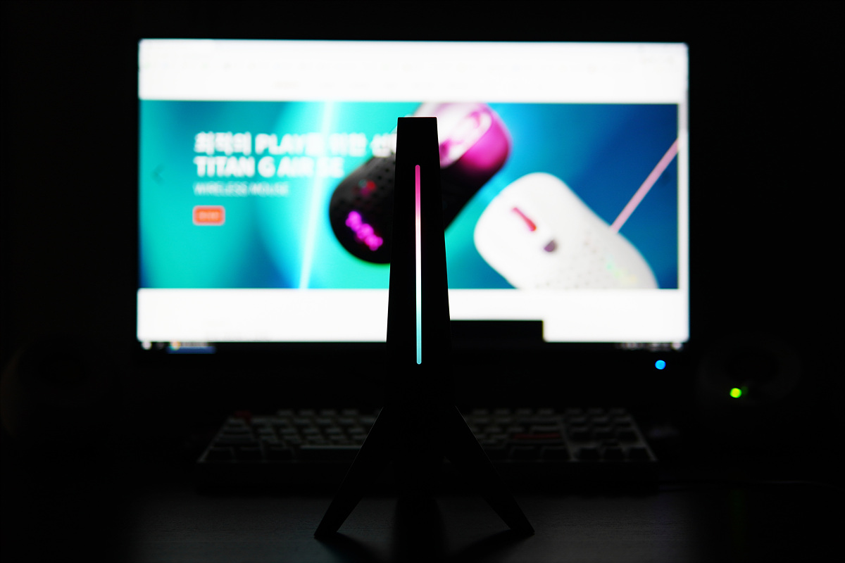앞쪽의 RGB LED는 화려함보다는 은은하게 켜지는 스타일입니다. 제품의 디자인처럼 이 부분 역시 호불호가 좀 갈릴 거라 생각합니다. (전 화려함보다는 이렇게 은은한 스타일을 더 좋아합니다.)