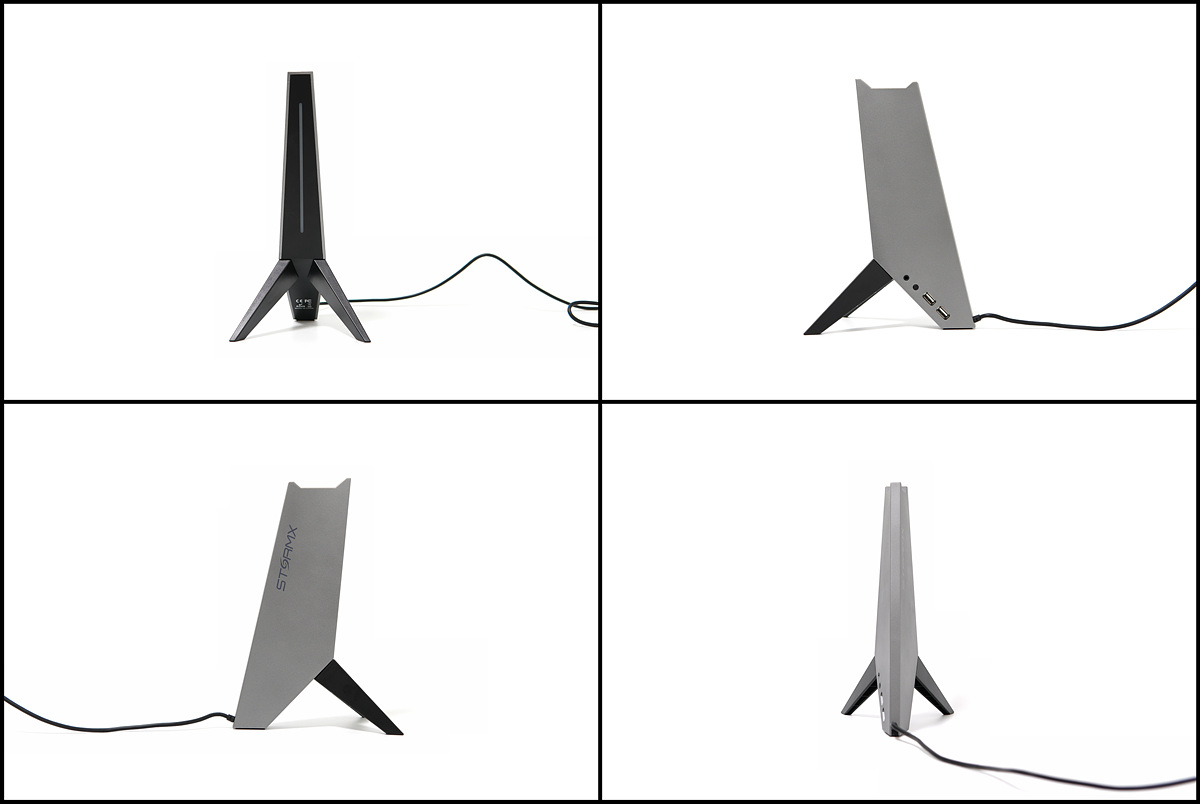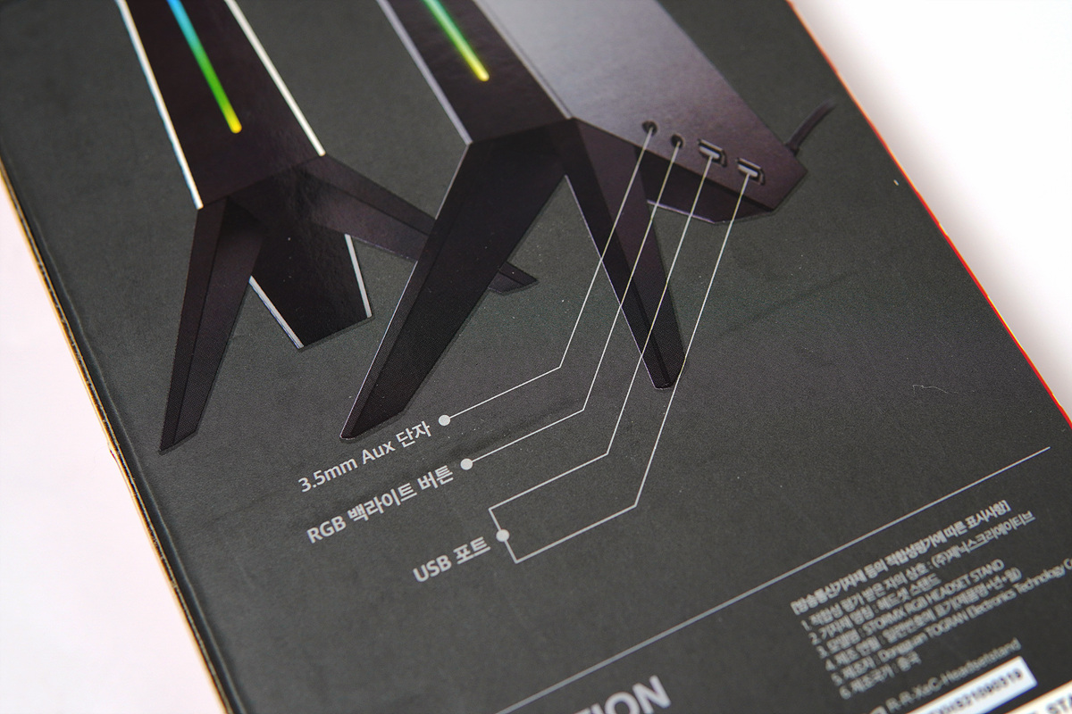 제품의 스펙을 간단히 정리해보았습니다. LED는 5가지 모드로 조절이 가능하며 원하지 않을 경우 끌 수도 있습니다. USB 2.0 포트 두 개가 있어서 키보드나 마우스, 게임 컨트롤러와 같은 입력 장치를 연결할 수 있습니다. 3.5mm 커넥터는 4극으로 되어있어서 3.5mm 헤드셋이나 이어폰을 연결해서 사용할 수 있습니다. 여러 가지 부가 기능이 있어서 헤드셋을 단순히 거치만 하는 제품보다 가격은 조금 높은 편입니다. 제닉스 STORMX 거치대의 외형이나 기능에 대해 자세하게 살펴보도록 하겠습니다.