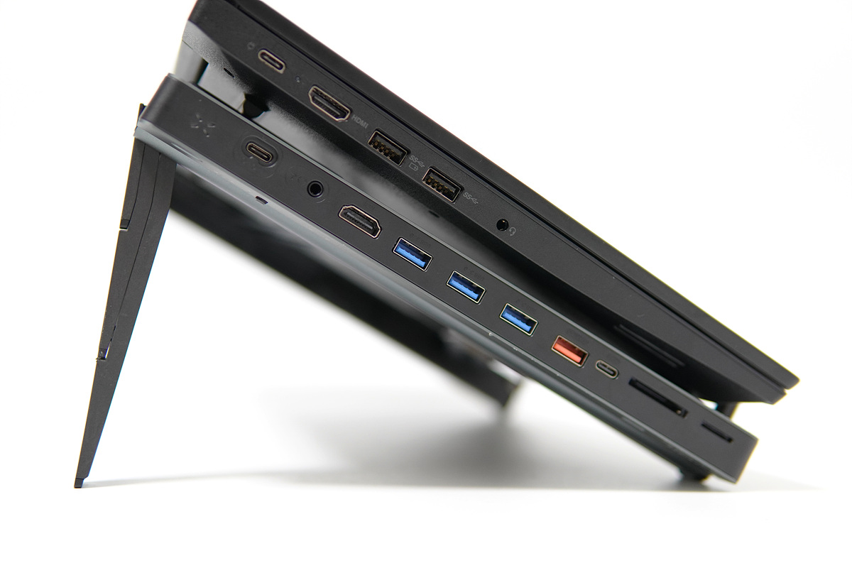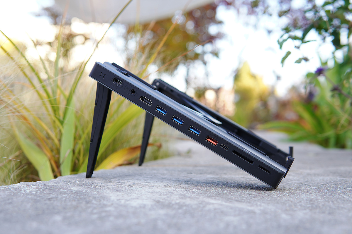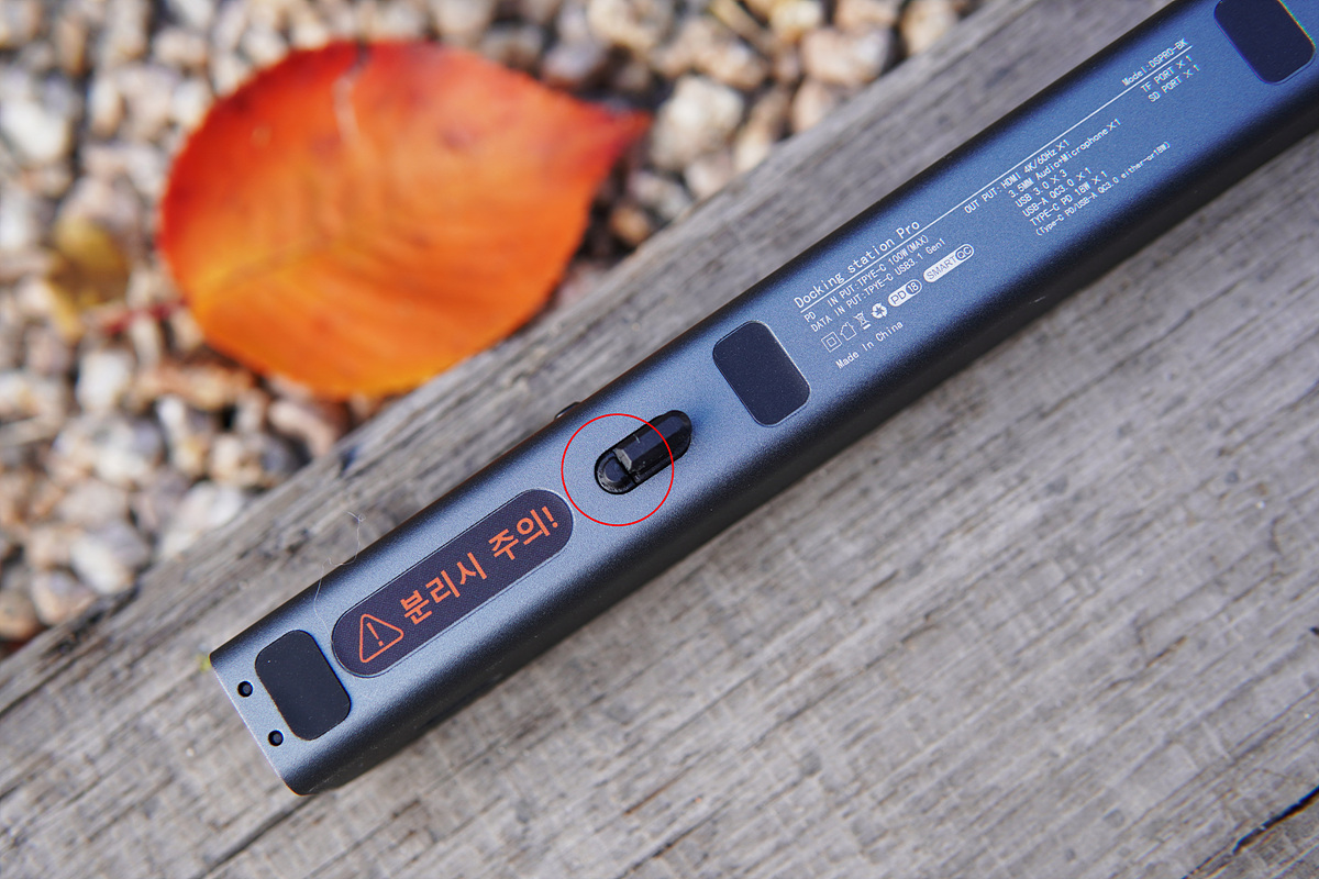 3개의 USB, HDMI, 사운드를 사용할 수 있는 9개의 확장 포트와 두 개의 충전 포트로 노트북에서 부족한 확장성을 채울 수 있는데 유선 LAN 포트가 없는 게 아쉬웠습니다. 오른쪽 측면의 Type-C 포트는 노트북의 충전에 사용할 수 있는 전원으로 최대 100W까지 사용할 수 있으니 출력이 높은 게이밍 노트북에서도 사용할 수 있습니다.