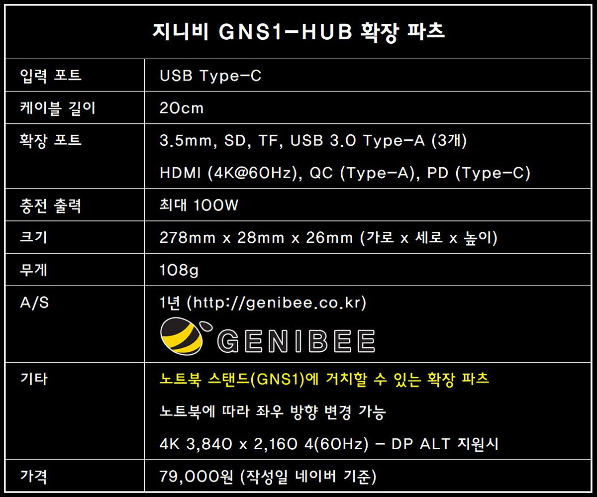 GNS1-HUB의 스펙을 간단히 정리해보았습니다. 기존의 GNS1 스탠드에 결합해서 사용하는 만큼 일체형처럼 깔끔하고 편리하게 사용할 수 있으며 스탠드와 허브를 따로따로 사용할 수도 있습니다. 다른 브랜드에서 일체형으로 나오는 제품들이 있지만 이 두 가지를 단독으로 사용할 수 있다는 점이 많이 다릅니다.