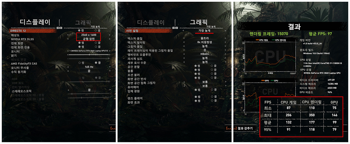 라이즈 오브 툼레이더에서는 가장 높음 프리셋으로 테스트를 했습니다. NVIDIA DLSS를 적용하니 2,560 x 1,600의 높은 해상도에서도 좋은 점수를 보여주었습니다.