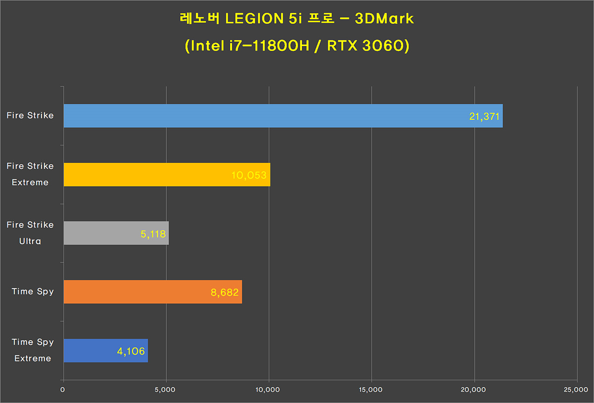 개인적으로는 3DMark를 테스트하고 상당히 놀랐습니다. RTX 3060이 장착이 되었지만 랩탑용이라서 일반적인 그래픽카드보다는 성능이 좀 낮을 거라 예상했는데 전혀 그렇지 않더군요. 얼마 전 테스트했던 RTX 3060과 거의 같은 점수(오차 범위 내)를 보여주었습니다.