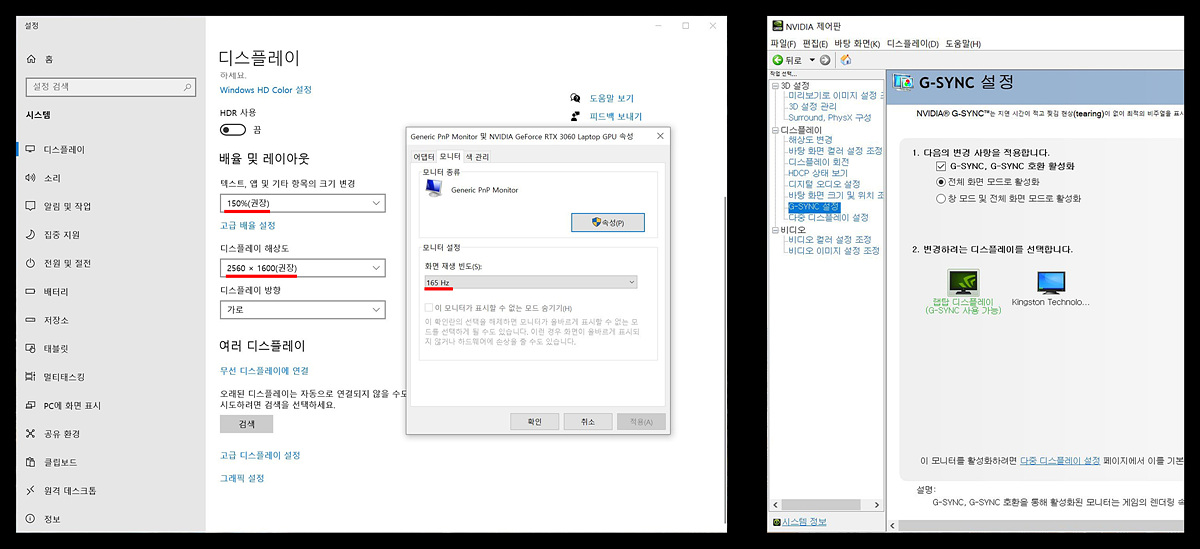 리전 5i 프로의 해상도는 16:9가 아닌 16:10 비율의 WQXGA(2,560x1,600) 해상도를 가지고 있으며 게이밍 노트북이라는 이름에 맞는 고주사율(165Hz)을 지원하고 있습니다. 엔비디아의 G-Sync 기능 역시 사용할 수 있습니다.