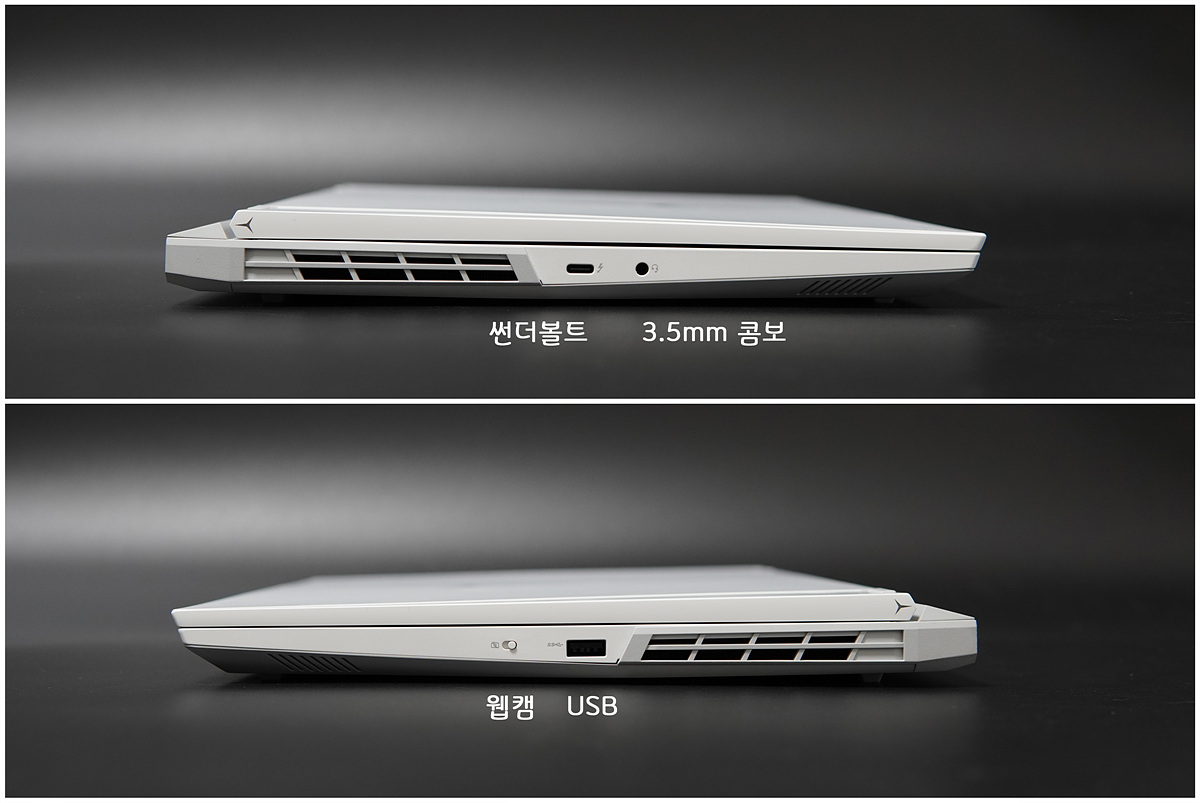 노트북의 단자에서도 다른 제품들과는 조금 다르게 측면 포트는 거의 없이 후면에 여러 가지 포트가 몰려 있습니다. 일반적이 노트북이라면 왜 이렇게 불편하게 했지?라고 생각하겠지만 리전 5i 프로는 게이밍이라는 점을 생각한다면 오히려 만족스러운 부분이었습니다. (이유는 아래에서 다시 소개하겠습니다.) 인텔 노트북의 장점 중에 하나인 썬더볼트 포트가 측면과 후면에 두 개 있는 부분 역시 인상적이었습니다.