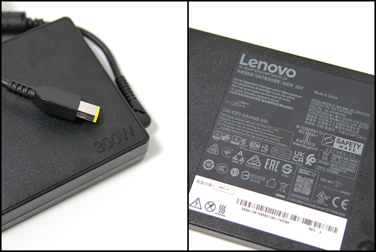 스펙에서 언급을 했지만 어댑터는 300W(20V, 15A)의 높은 출력을 가지고 있어서 크기가 제법 큰 편입니다. 커넥터는 사각형으로 되어있으며 Type-C 포트처럼 방향에 관계없이 편리하게 사용할 수 있습니다.