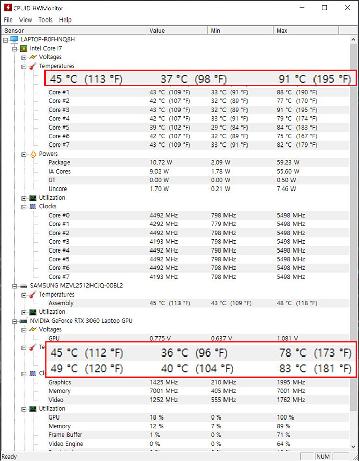 게임을 할 때는 CPU 91도 / VGA 83도로 측정이 되었습니다. 게임을 진행할 때는 쿨링을 위해 팬 소음이 제법 있지만 제품의 성격을 생각한다면 단점으로 여길만한 부분은 아니었습니다. SSD의 온도는 게임이 아닌 벤치를 할 때의 최고 온도입니다. SSD 테스트는 측정할 때마다 속도 차이가 너무 심하게 나서 따로 벤치를 올리지는 않았습니다. (여러 가지로 테스트를 했는데 이유를 알아내지 못했습니다.)