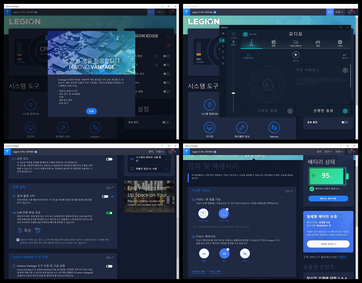 Lenovo Vantage 프로그램을 사용하면 배터리의 상태뿐 아니라 키보드의 LED를 바꿀 수 있으며 나히믹(Nahimic) 오디오를 통해 3D 서라운드 설정을 할 수 있습니다.