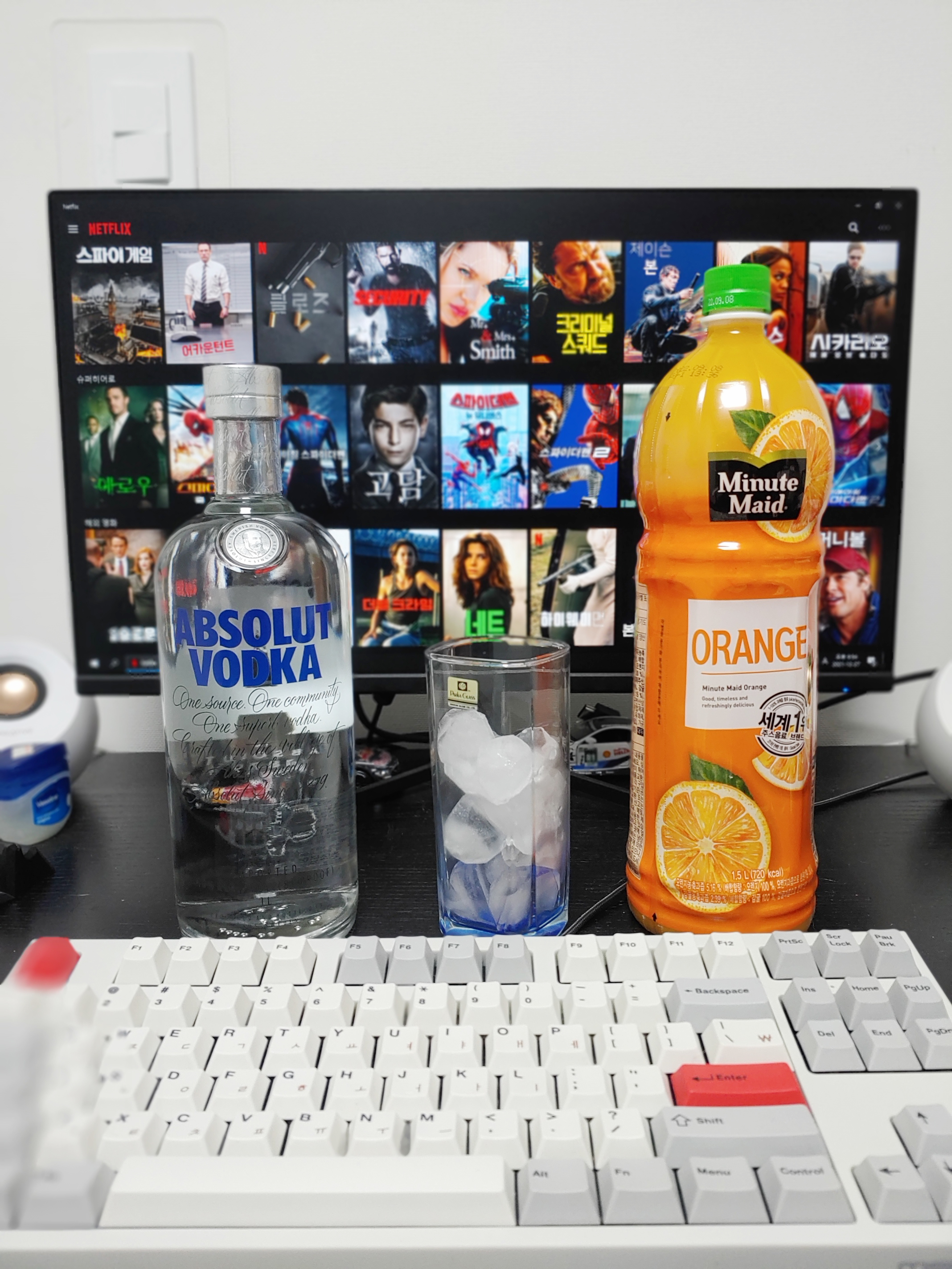 집 근처에 있는 주류백화점에서 구입한 1리터짜리 앱솔루트 보드카입니다. 32,000원에 구입했는데 위스키 1/2 가격이라 괜찮은거 같습니다. 넷플릭스 보면서 칵테일로 먹기에는 딱 좋네요. 위스키보다 보드카를 먹는 게 더 빨리 훅~~ 가더군요. (칵테일로 먹어서 그런가?)
