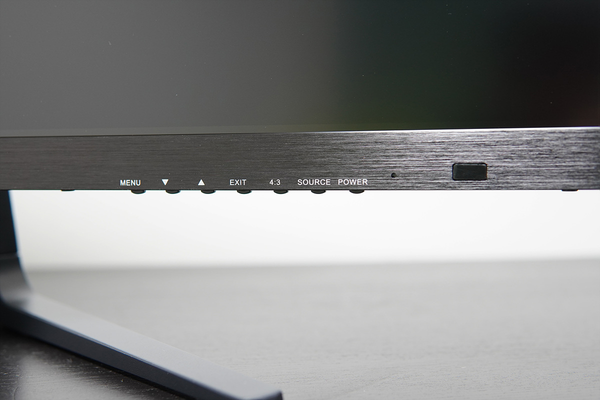 오른쪽 아랫부분에는 전원과 OSD를 설정할 수 있는 6개의 버튼이 있으며 옆으로는 전원 LED와 리모컨을 사용할 수 있는 IR 수신부가 있습니다.