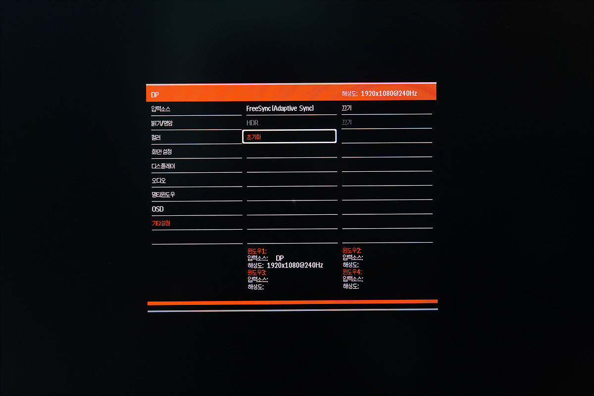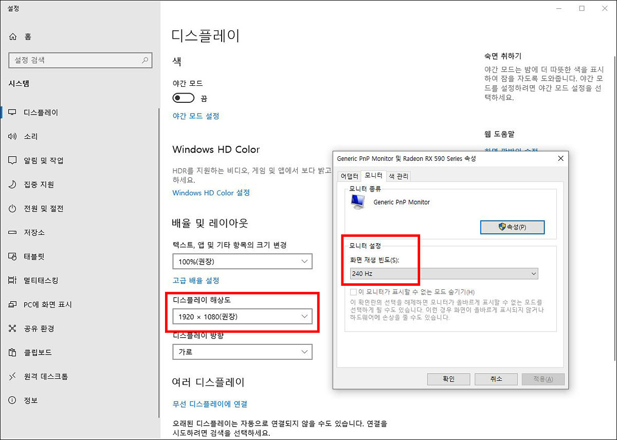 1,920 x 1,080 FHD의 해상도와 240Hz의 주사율을 설정할 수 있습니다.