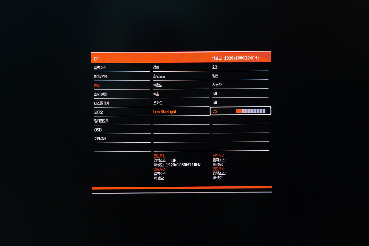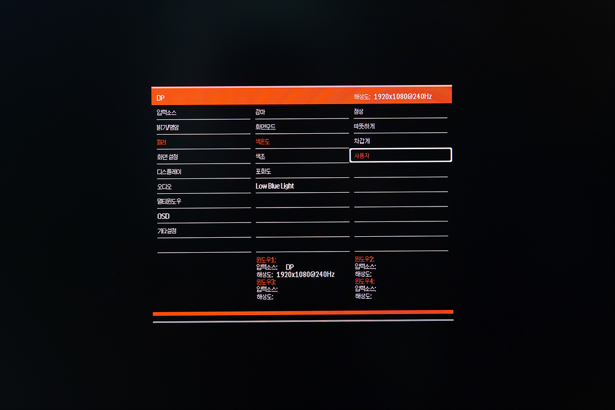 캘빈 값을 바꿀 수 있는 색온도는 기본이 사용자 모드로 되어있으며 이 설정일 때 노란빛이 조금 도는 편입니다. 차갑게는 파란색이 너무 강한 편이라 정상 / 따뜻하게 두 가지 모드로 사용하는 걸 추천합니다. 이 세팅은 제 개인적인 느낌이므로 절대적인 값은 아닙니다. 색온도를 설정하면서 자신에게 잘 맞는 값으로 사용하는 게 가장 좋습니다. 사용자 모드에서는 R / G / B 3개의 값을 각각 따로따로 조절할 수 있습니다.