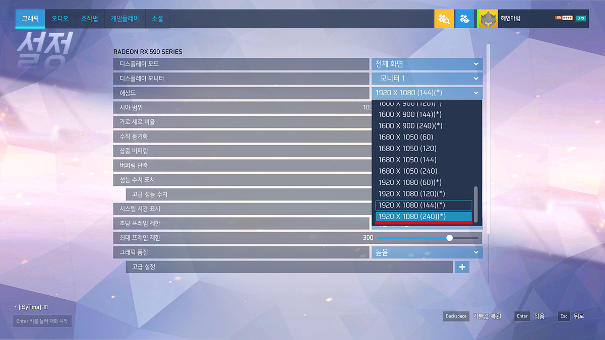 오버워치 옵션에서 FHD / 240Hz를 설정할 수 있습니다.