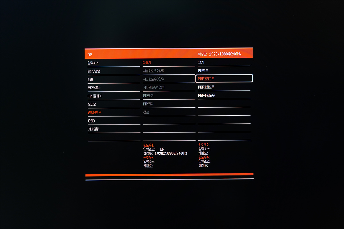 MB27F240의 큰 특징 중 하나인 PIP / PBP 기능입니다. 메인은 입력 소스 1번으로 동작하게 되고 나머지 2, 3, 4번 값의 변경을 통해서 사용과 위치를 바꿀 수 있습니다.