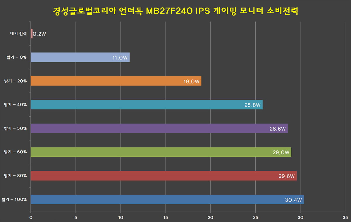 소비전력은 27인치 크기에서는 일반적인 수준이었습니다. 앞서 언급했지만 밝기가 좀 밝은 편이라 25~30 정도로 사용할 수 있었으며 이때는 약 20W의 소비전력을 보여주었습니다.