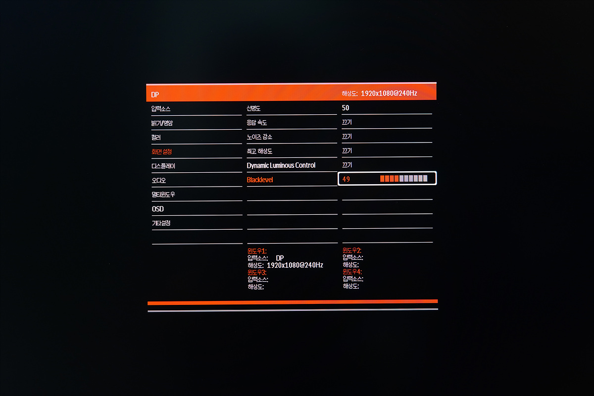 게임 모드에서도 어두운 곳을 좀 더 밝게 표현해야 된다면 블랙 레벨 값을 좀 더 올려서 사용할 수 있습니다. 블랙 레벨은 1 단위로 조절할 수 있습니다.