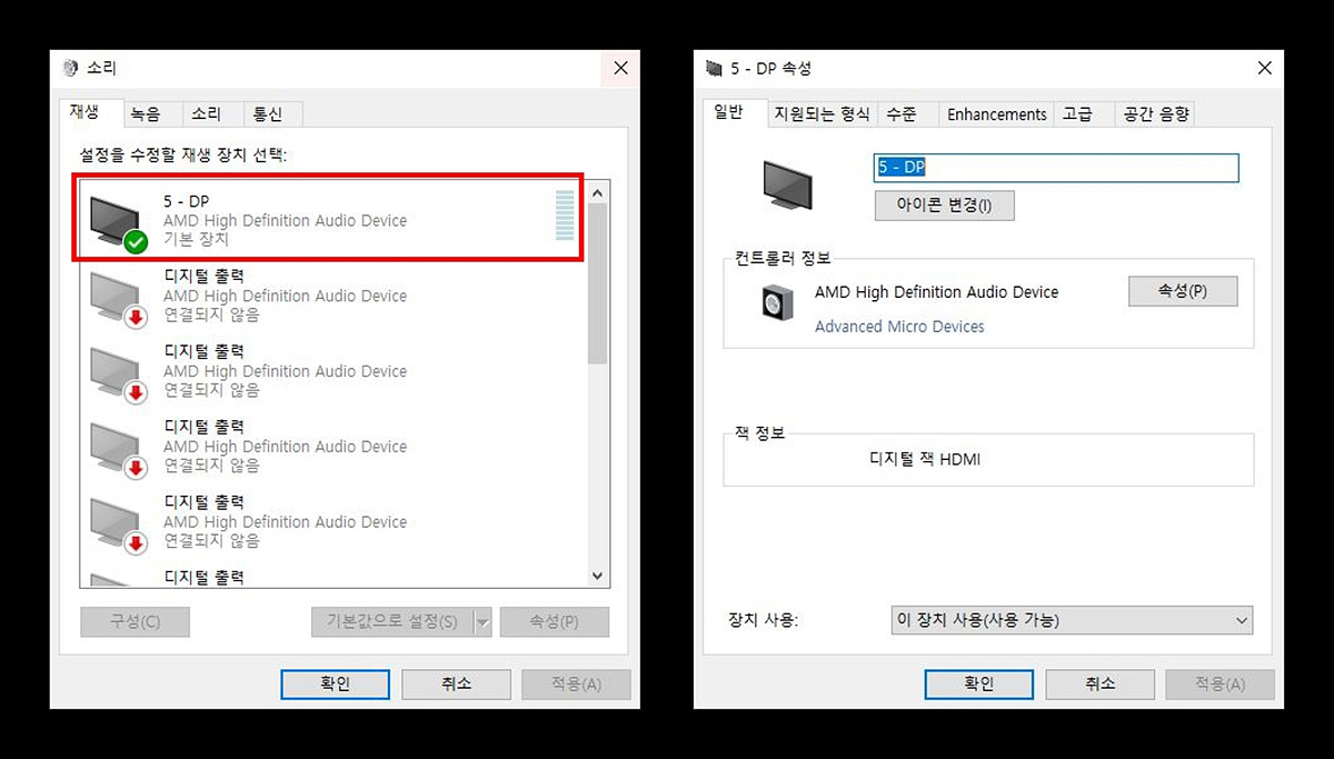 DP, HDMI 케이블을 연결했을 때는 모니터의 스피커를 사용할 수도 있으며 이때는 해당 장치(모니터)를 기본 장치로 선택해야 합니다.