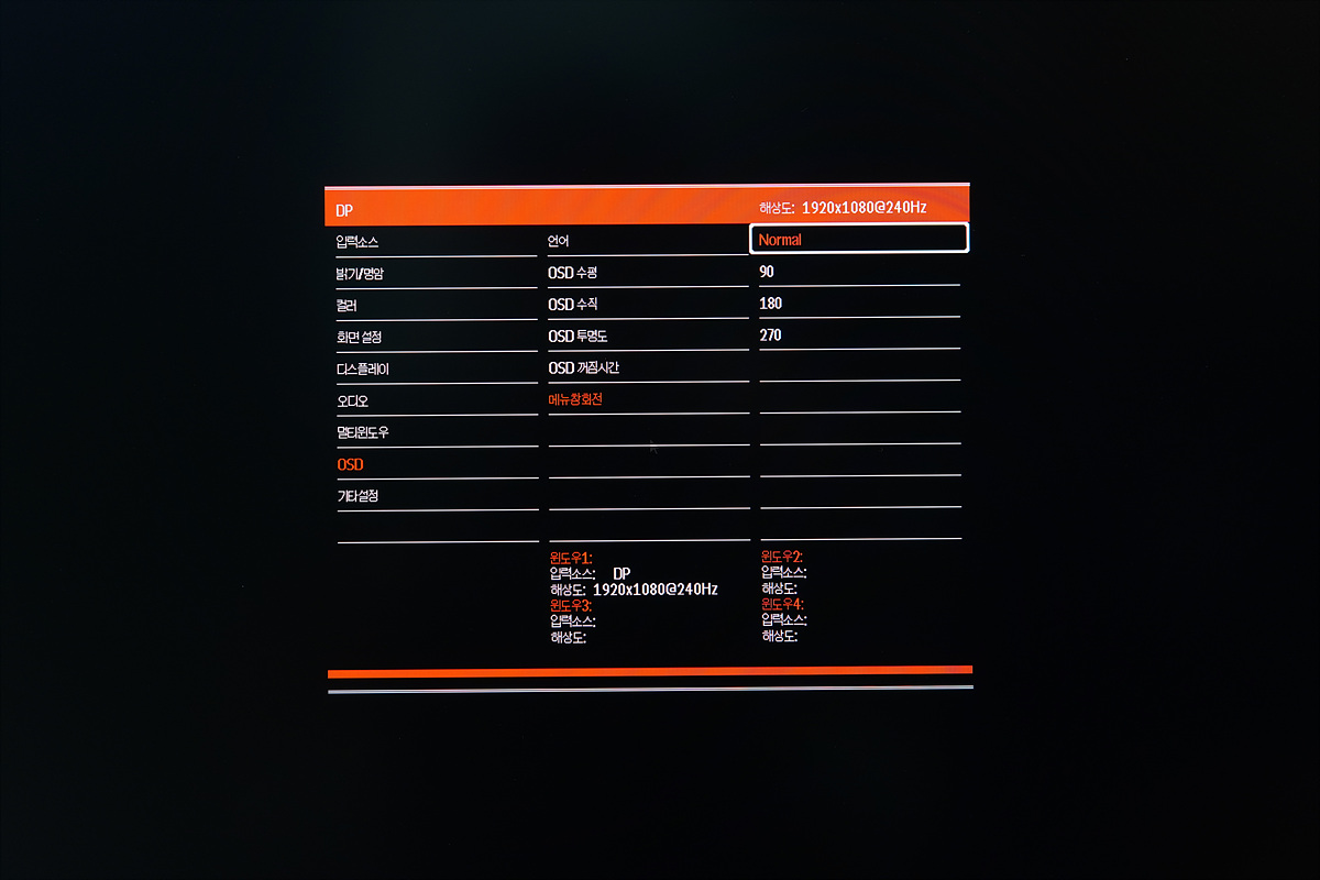 모니터 암을 연결해서 피벗 모드를 사용할 때는 OSD 화면도 같이 회전해서 사용할 수 있습니다. 모니터를 세로 모드로 사용하는 분들에게는 꼭 필요한 기능 중 하나입니다.