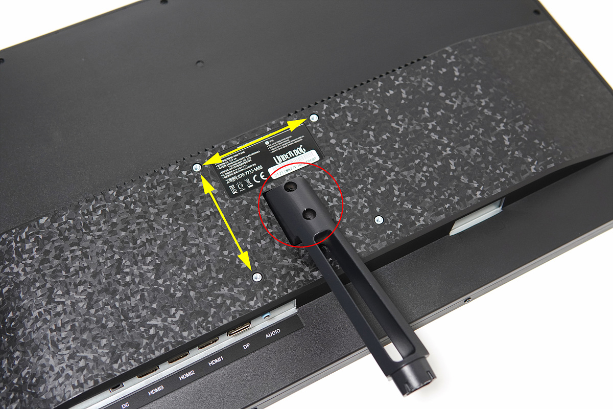 모니터 암을 사용할 수 있는 베사홀은 100mm x 100mm이며 이때는 빨간색 동그라미 부분의 나사 두 개를 풀어서 스탠드 넥(neck)을 분리해야 합니다.