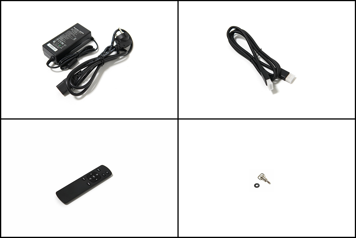모니터, 스탠드, 고정 나사, 설명서, 리모컨, DP 케이블, 전원 케이블과 어댑터로 이루어져 있습니다.