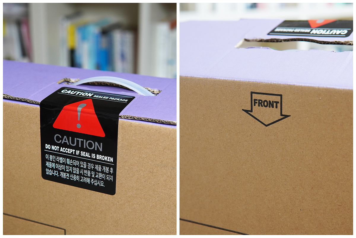 박스 위로 봉인 스티커가 있으며 패널의 방향을 확인할 수 있는 표시가 되어있습니다.