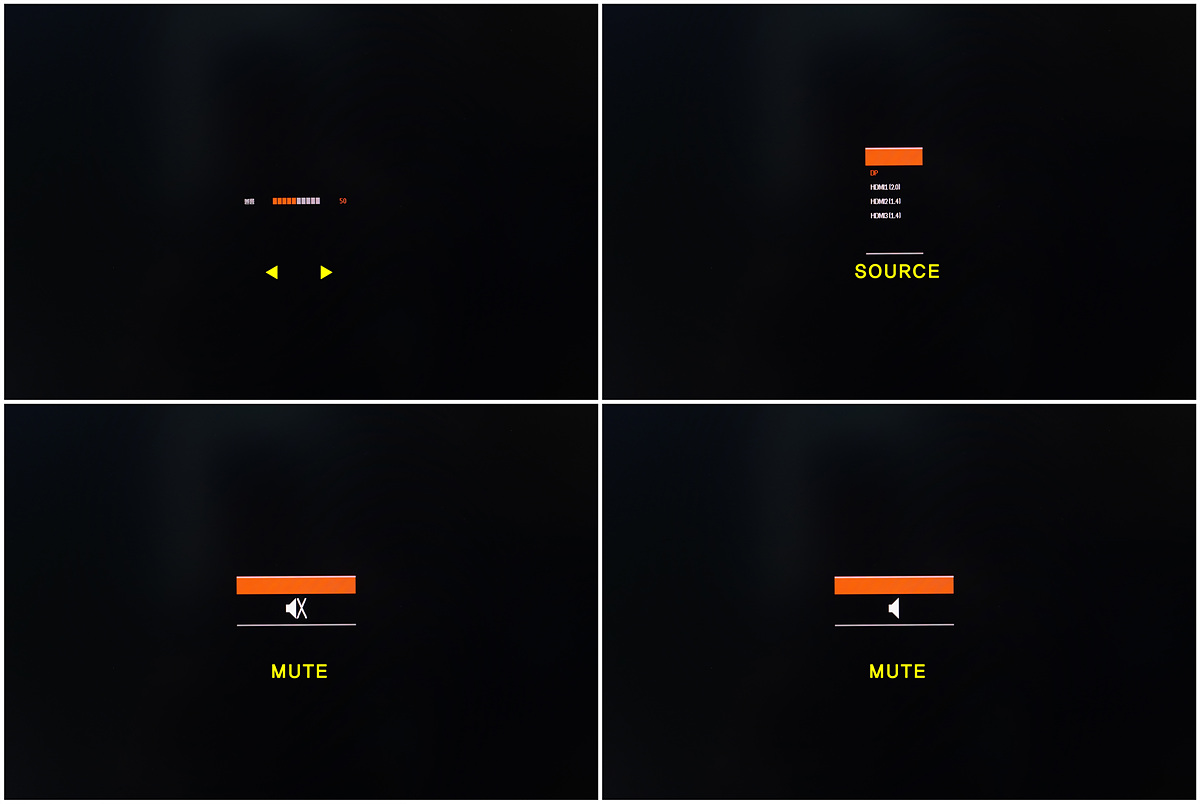 리모컨의 좌/우 방향키를 누르면 볼륨을 조절할 수 있으며 Source 버튼으로 4개의 입력(DP, HDMI 1, 2, 3, 4)을 바꿀 수 있습니다.