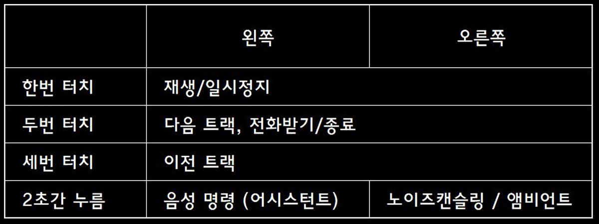 피아톤 로고가 있는 부분을 터치해서 기능을 조절할 수 있습니다. 터치 감도나 위치가 좋은 편이라 오동작에 의한 스트레스는 없었습니다. 이어 버드는 좌우 구분 없이 한쪽만 사용이 가능한데 단독으로 사용할 때는 따로 구분이 없지만 두 개 모두 장착을 했을 때는 왼쪽이 아닌 오른쪽 터치로 기능을 조절할 수 있었습니다. 설명서에는 이런 부분이 나와있지 않아서 처음에는 조금 헷갈리더군요.