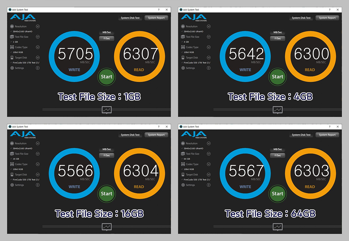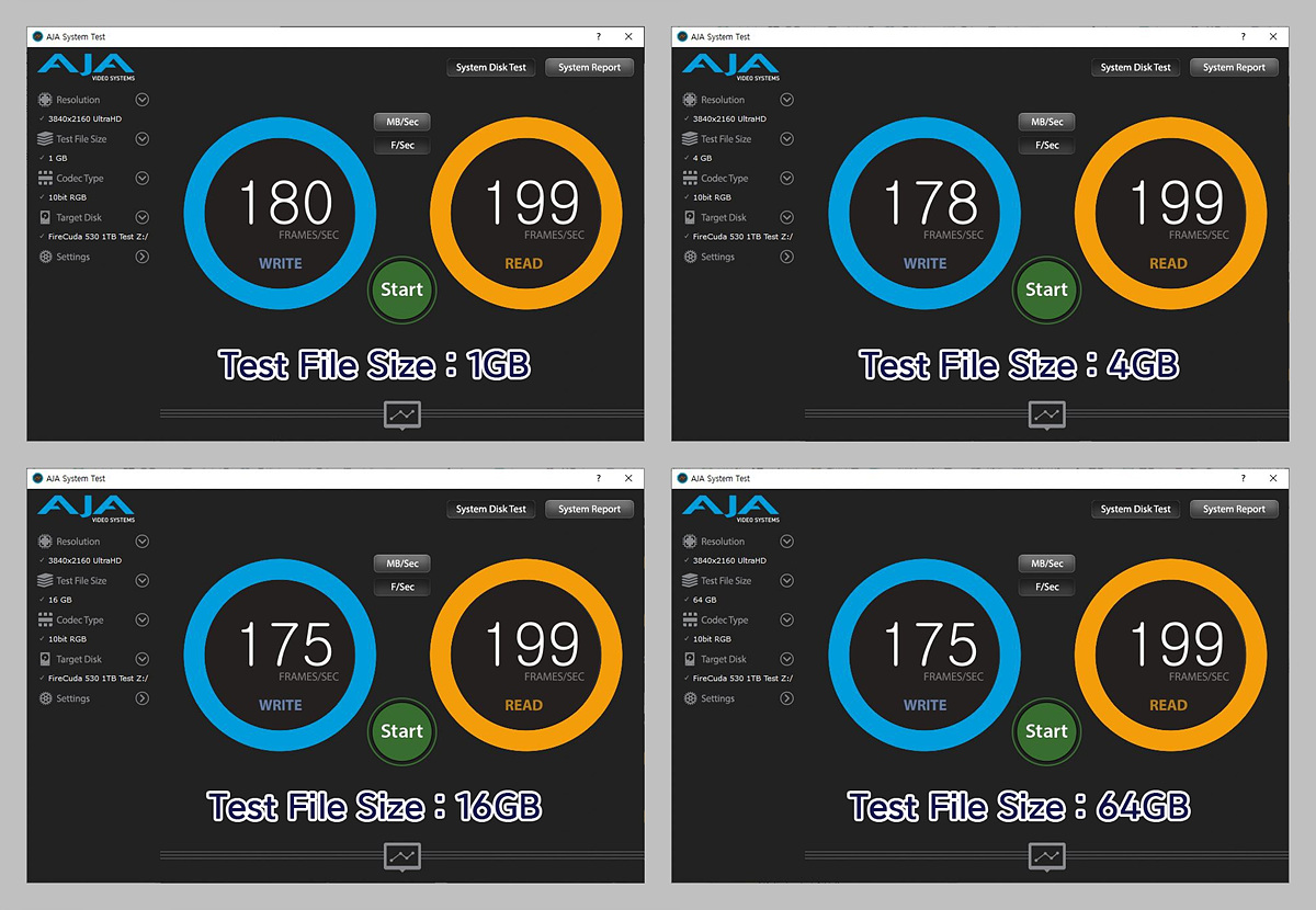 AJA 테스트는 UHD / sRGB 100%를 기준으로 1GB / 4GB / 16GB / 64GB 각각의 속도(MB/Sec)와 프레임(F/Sec)을 측정하였습니다.