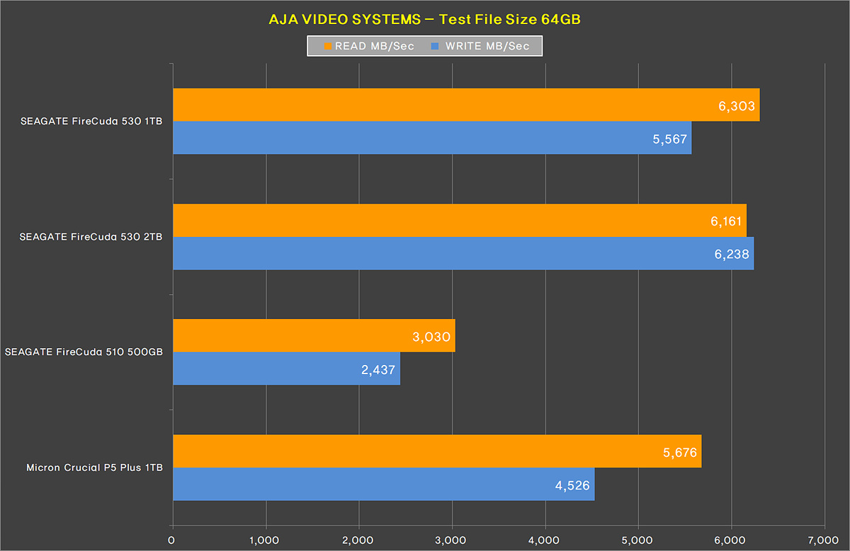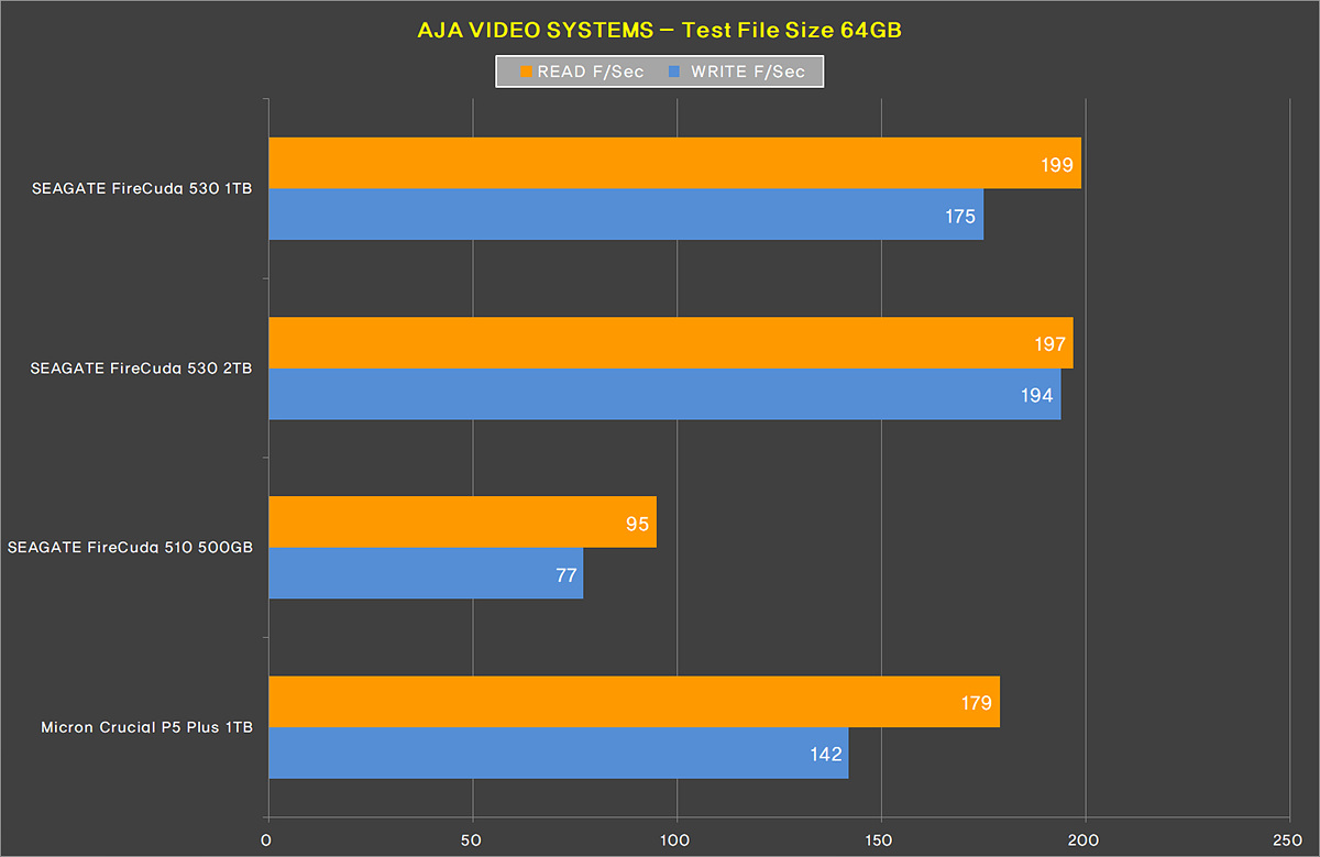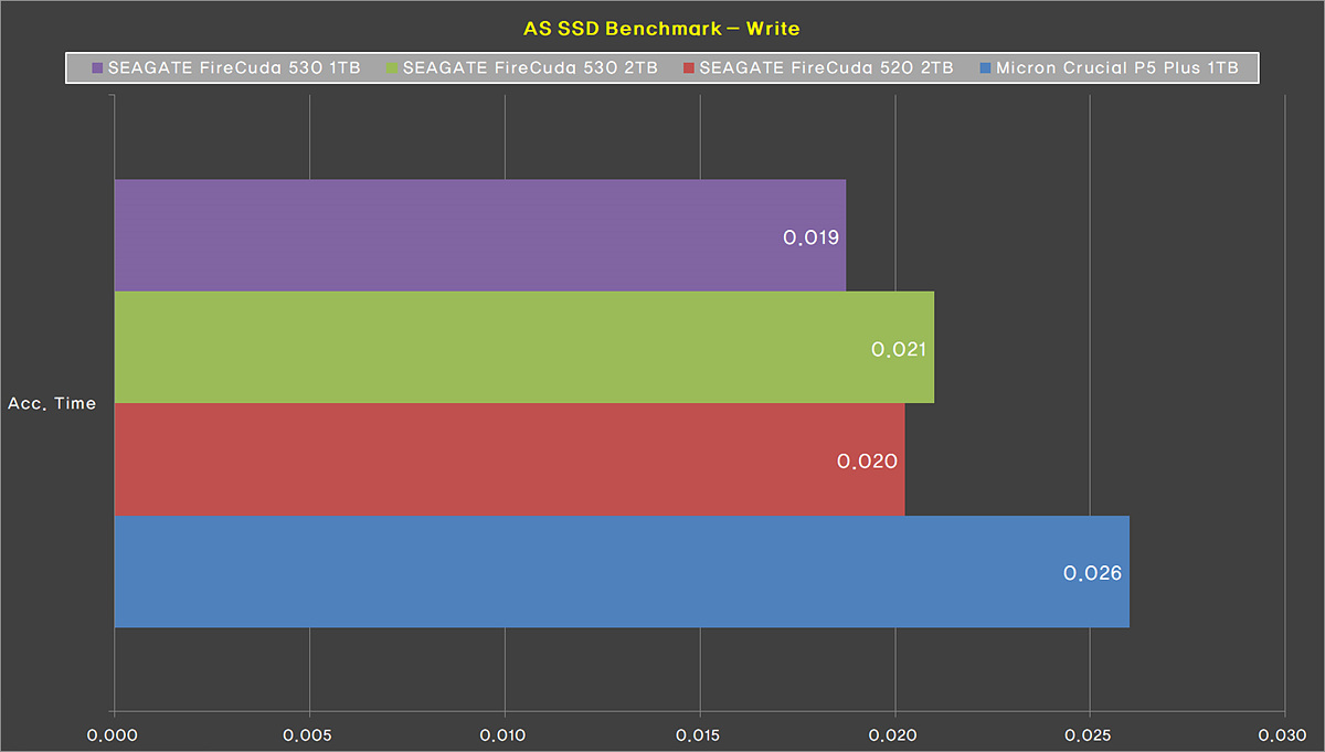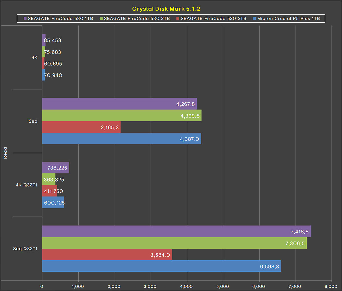 다른 벤치 테스트와 마찬가지로 파이어쿠다 530 2TB보다 쓰기(Write)에서는 살짝 뒤처졌지만 읽기에서는 모두 조금 더 앞서는 결과를 보여주었습니다.