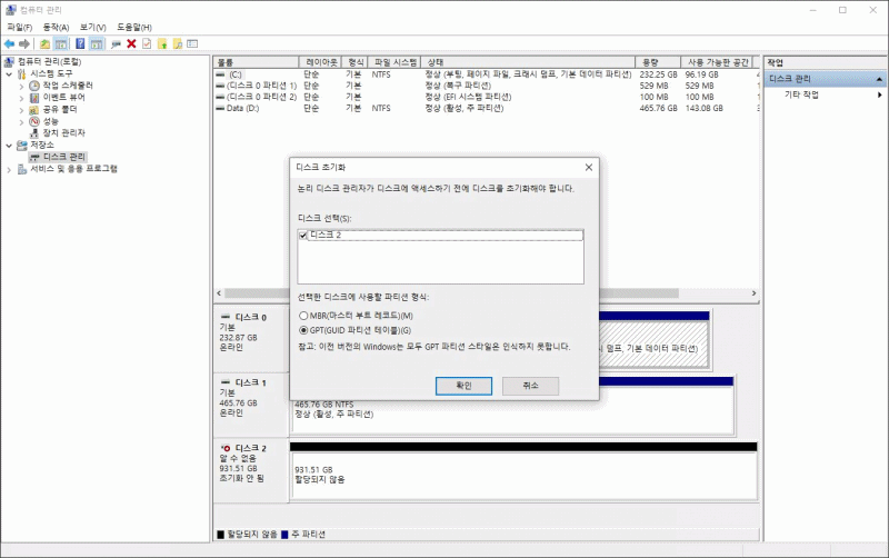 내장형 저장 장치들은 제대로 장착을 했어도 디스크의 볼륨을 할당해주고 포맷을 해야 정상적으로 사용할 수 있습니다. 이 작업은 내 컴퓨터(우클릭) -> 관리 -> 저장소 -> 디스크 관리에서 할 수 있습니다. USB 타입의 외장형 저장장치(HDD, SSD)들은 이런 작업 없이 바로 사용할 수 있습니다.