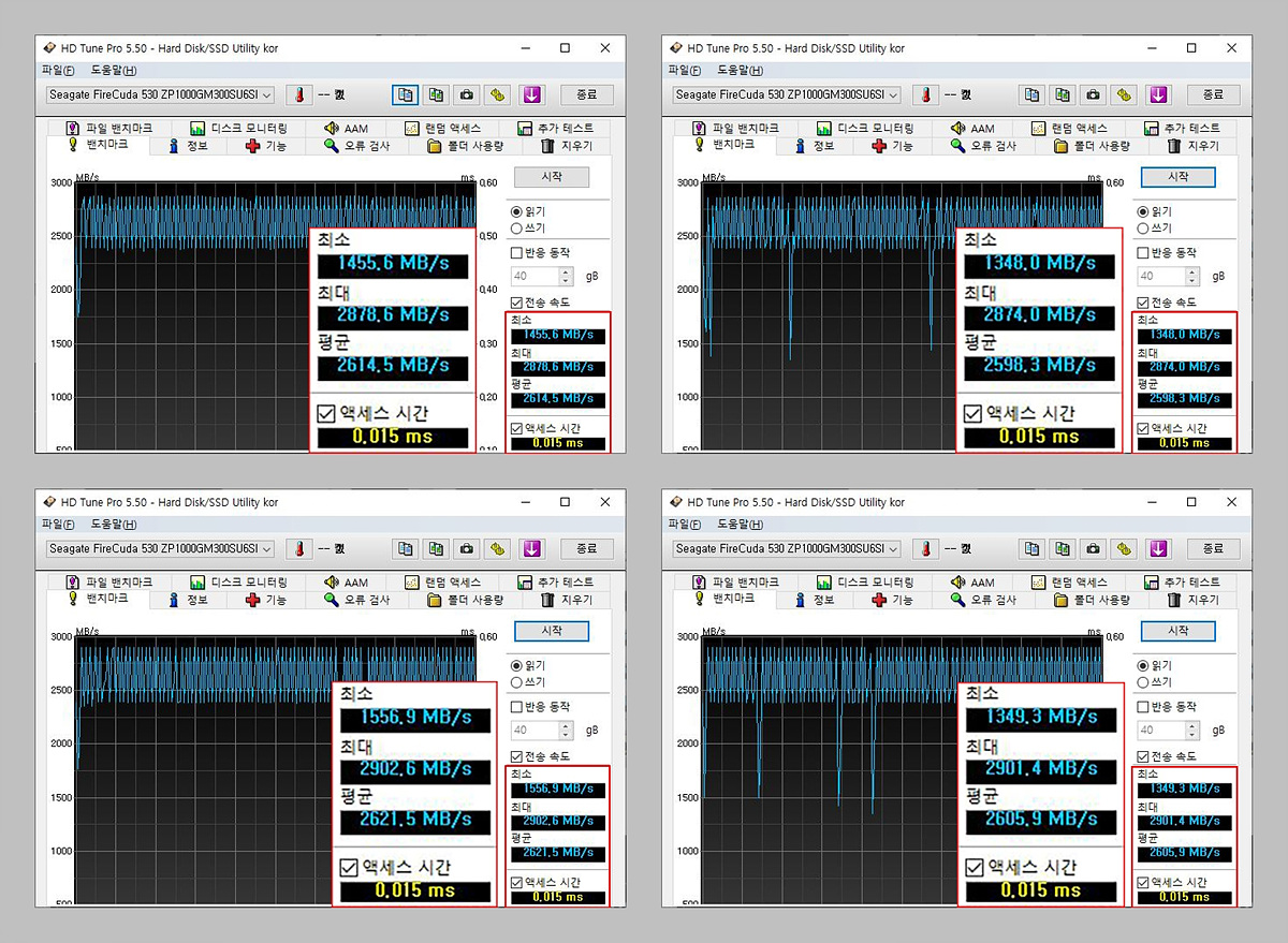 HD Tune Pro를 4회 측정한 결과의 평균값입니다. 그래프상에서 조금은 들쭉날쭉한 모습이었지만 수치는 다른 테스트와 마찬가지로 상당히 좋은 결과를 보여주었습니다.