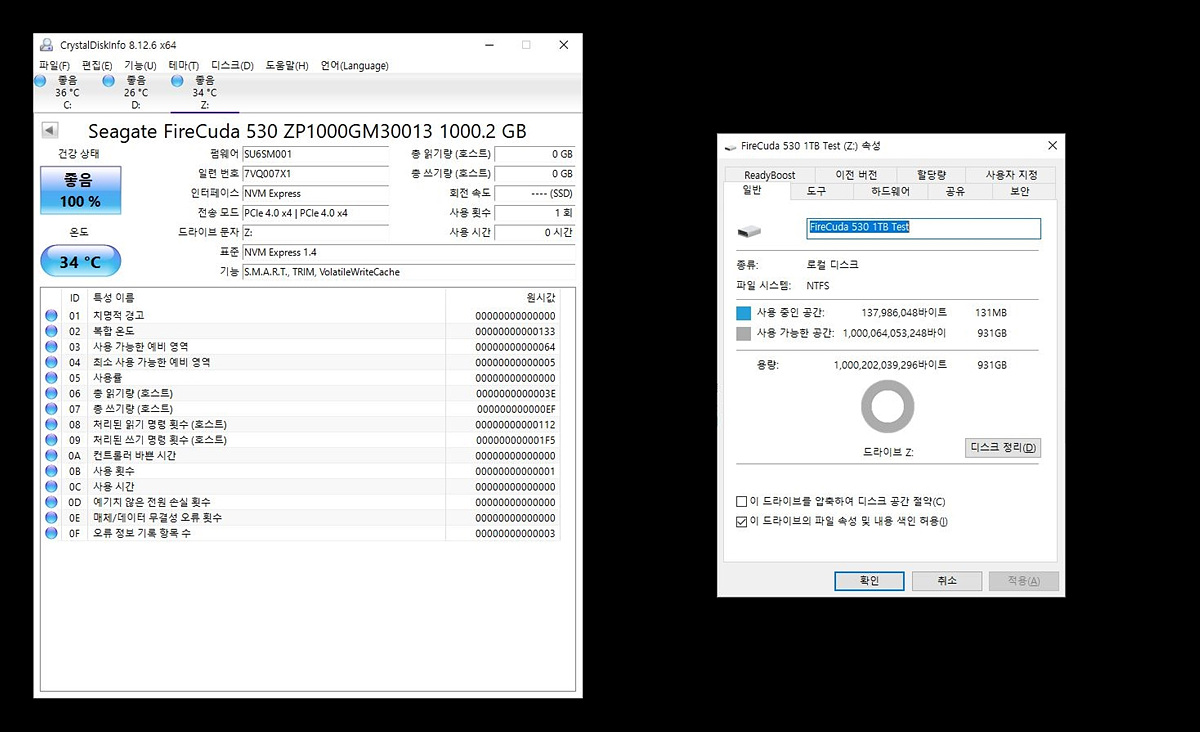 테스트를 위해 Z: 드라이브로 할당을 해주었으며 제품의 상태는 Crystal Disk Info에서 확인할 수 있습니다.