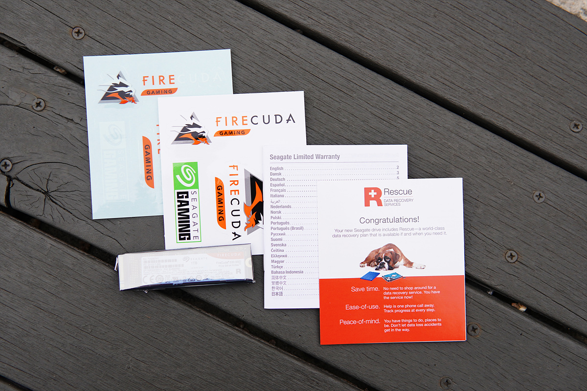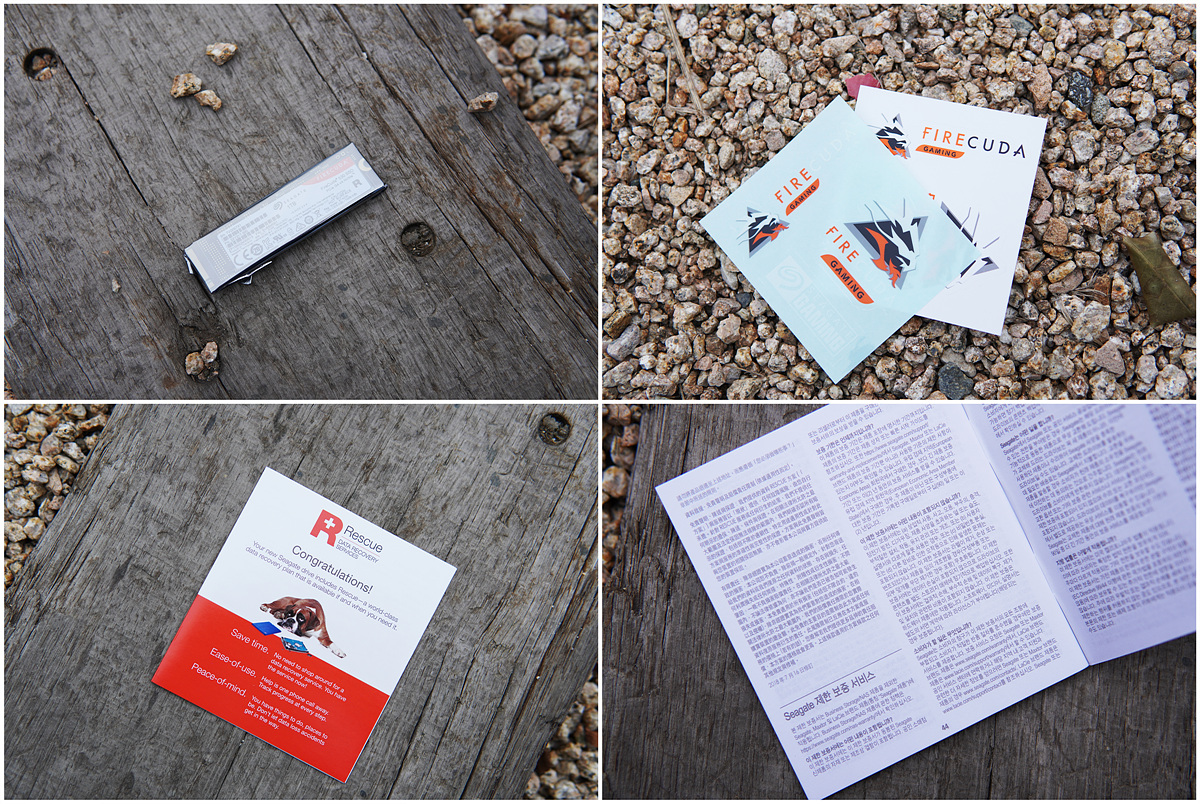 SSD, 스티커 두장, 워런티 가이드와 레스큐 데이터 복구 서비스에 대한 안내서로 이루어져 있습니다. 파이어쿠다의 경우 씨게이트 SSD에서 최상위 모델이기도 하고 게이밍이라는 상징성이 있기 때문에 스티커가 포함된 건 상당히 칭찬해주고 싶습니다. (제가 이런 스티커를 정말 좋아합니다. ^^)