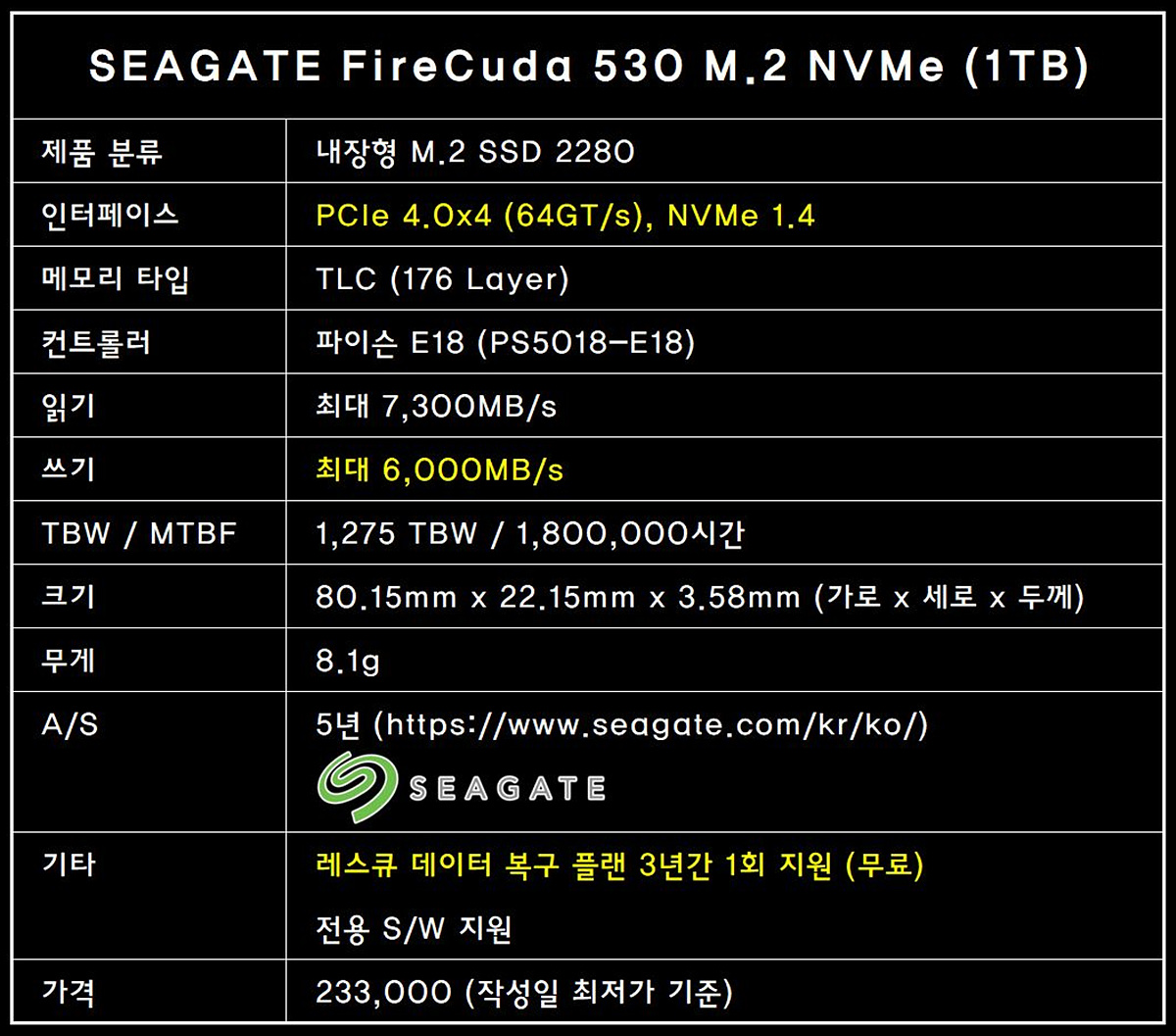 제품의 스펙을 간단하게 정리해보았습니다. 파이어쿠다 530은 빠른 속도(7,300MB/s, 6,000MB/s)와 함께 SSD에서 가장 중요한 TBW 역시 다른 제품들보다 큰 편입니다. 또한 씨게이트 제품들의 가장 큰 특징인 레스큐 데이터 복구 서비스를 이용할 수 있습니다. 씨게이트 HDD, SSD를 이야기할 때 절대 빠질 수 없는 부분이죠. 개인적으로는 이거 하나만으로도 충분한 가치고 있다고 생각합니다.