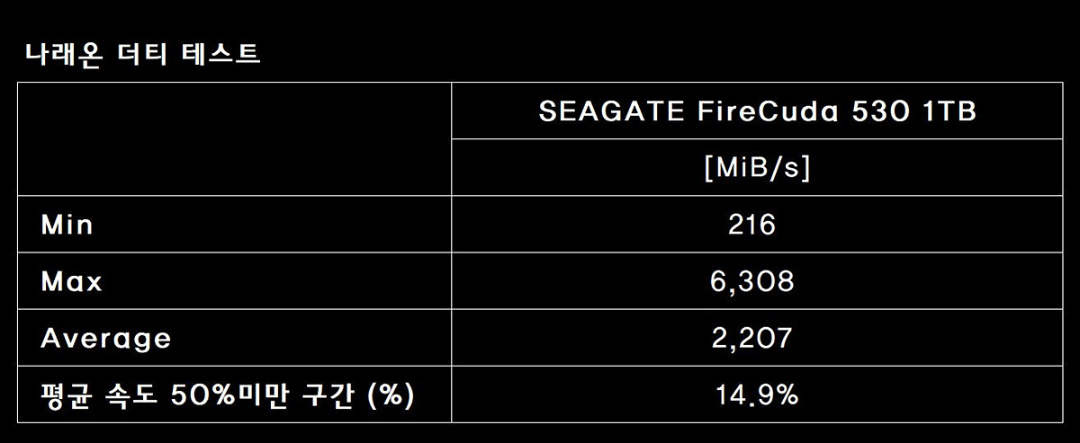 SSD를 테스트할 때 가장 중요하게 생각하는 나래 테스트의 결과도 좋은 모습을 보여주었습니다. 나래의 경우 전체 테스트 시간을 비교해보면 성능을 알 수 있습니다. 일부 디램리스 SATA, QLC NAND를 사용한 제품의 경우 캐싱 구간이 지나면 속도가 급격하게 떨어져서 평균 속도나 테스트 시간이 상당히 오래 걸리게 됩니다. 일부 벤치에서 캐시 메모리만 보여준다거나 100%가 아닌 특정 구간만 테스트해서 보여준다면 그 부분의 신뢰성은 굉장히 낮은 편이라고 판단할 수 있습니다.