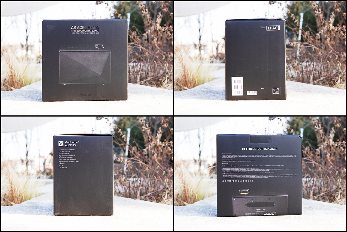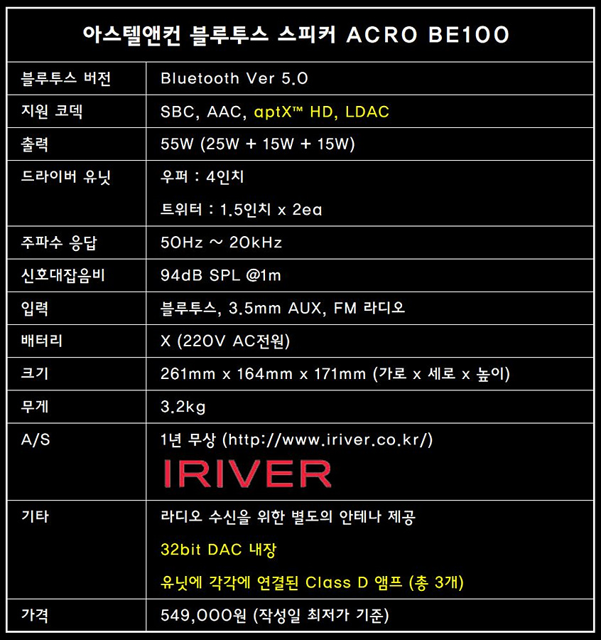 제품의 스펙을 간단하게 정리해보았습니다. 보통 블루투스 스피커라고 하면 배터리가 내장된 제품을 떠올리지만 ACRO BE100은 배터리가 아닌 유선(AC) 전원이 필요한 스피커입니다. 또한 기존 블루투스 스피커와 다르게 별도의 DAC가 내장되어있으며 3개의 드라이버에 각각의 앰프가 연결이 되어있어서 보급형 스피커와는 확실한 차별성을 가지고 있습니다. (보통은 블루투스 칩셋에 있는 DAC를 사용하고 있습니다.) 이런 구성 때문인지 코덱 역시 aptX HD와 LDAC 두 가지를 모두 지원하고 있습니다. 이렇게 두 가지 코덱을 모두 지원하는 블루투스 스피커는 거의 없는 걸로 알고 있습니다.