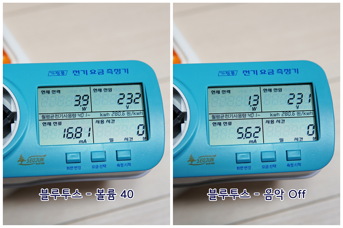 볼륨을 40으로 음악을 재생하는 상태에서는 3.9 ~ 4W의 소비전력이 측정되었고 음악을 재생하지 않고 스피커만 켜 둔 상태에서는 1.3 ~ 1.4W의 소비전력이 측정되었습니다.