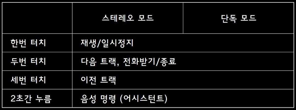 터치 기능에 있어서 조금 특이했던 부분은 두 개 모두 사용하는 스테레오 모드와 좌/우 유닛 한 개 만을 사용하는 단독 모드에서의 기능이 모두 똑같다는 점이었습니다. 블루투스 이어폰을 자주 테스트하는 입장에서 이 기능은 상당히 편리하더군요. 스테레오로 사용할 때나 단독으로 사용할 때나 헷갈리지 않고 바로바로 사용을 할 수 있었습니다.