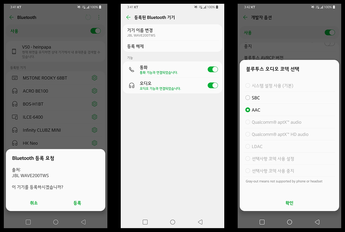페어링 과정은 다른 블루투스 장비들과 같으며 코덱은 SBC, AAC를 지원합니다.