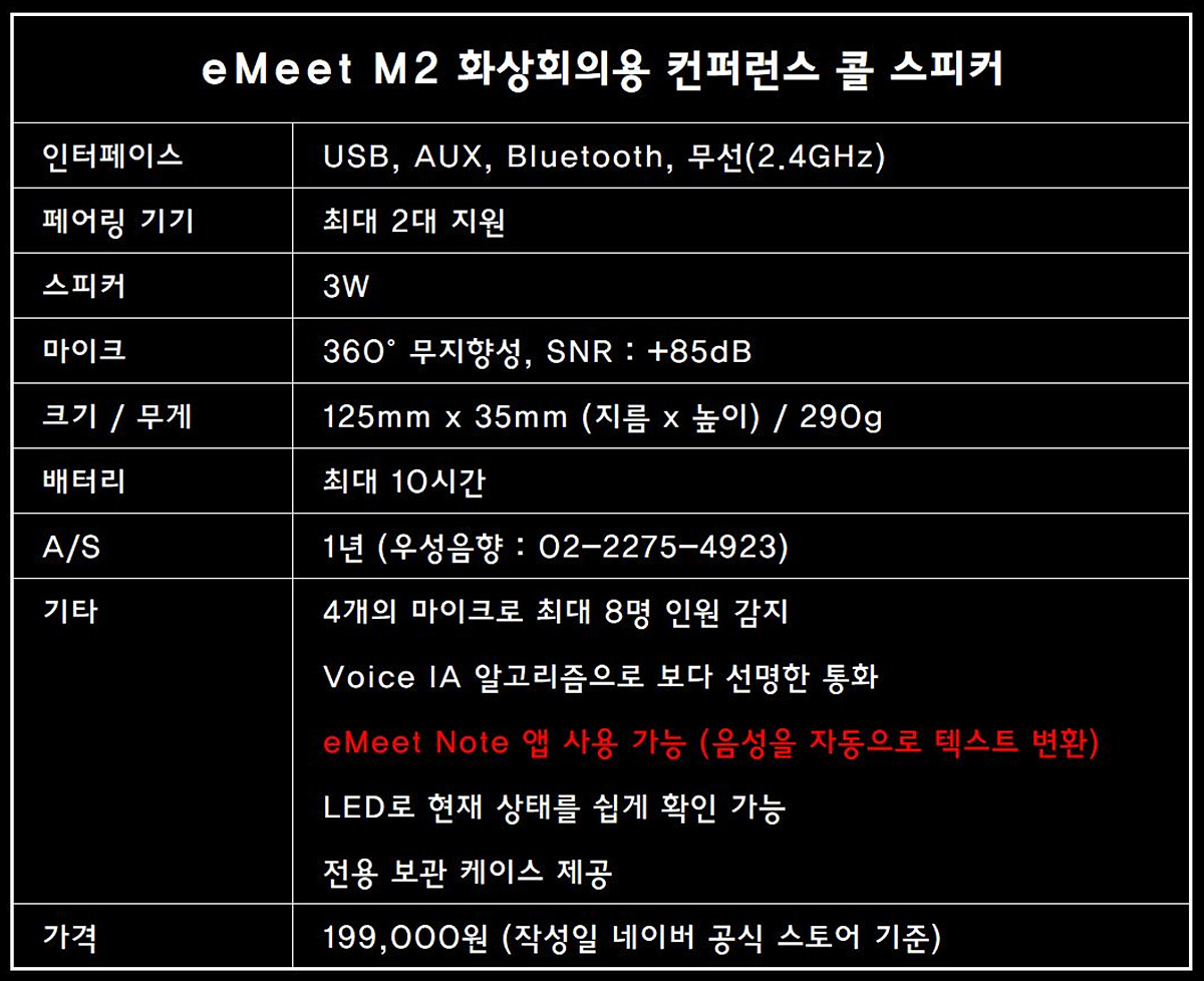 eMeet의 제품들은 10만원 초반대부터 39만원대까지 4가지 종류가 있으니 사용하는 장소의 크기나 주머니 사정에 맞게 선택을 하시기 바랍니다. 회의에 동시 참여하는 인원이 10명이 넘어간다면 M2 MAX 제품으로 선택을 하시고 2-3명 정도로 적은 인원이 사용할 때는 eMeet LUNA(루나) 제품이 좋겠죠. 낮에는 재택근무로 사용을 하고 저녁에는 아이들 인강에서 사용을 하면 좀 더 활용도를 높일 수 있을 거라 생각합니다. 특히나 스마트폰이나 태블릿에 있는 기본 스피커보다는 훨씬 더 좋은 효과를 경험할 수 있습니다. 제품의 장단점을 끝으로 마무리를 하겠습니다. 잘못된 점이나 추가되어야 할 부분이 있다면 알려주세요.