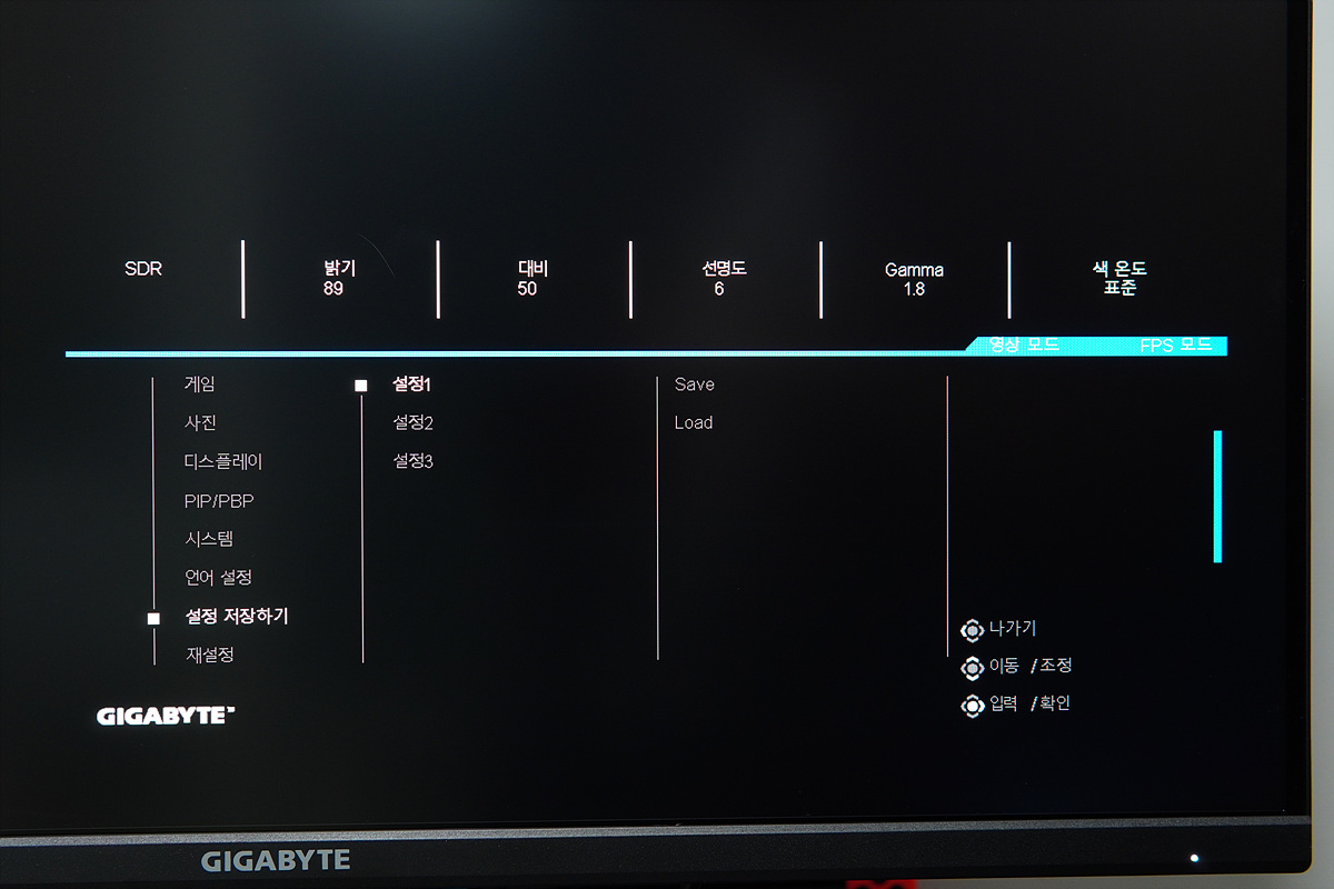 다른 모니터들에 비해 설정이 상당히 많은 편이라 사용자 세팅을 따로 저장할 수 있습니다. 총 3개까지 프로필을 저장할 수 있으며 가장 아래에 있는 재설정을 누르면 이 저장 내용도 사라지게 됩니다.