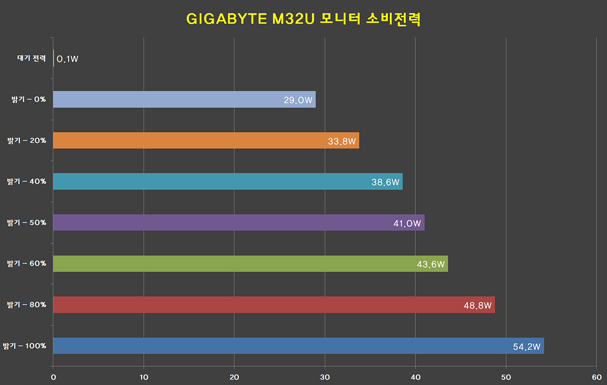 모니터의 소비전력은 일반 모드에서 측정을 했습니다. 350cd의 스펙 때문인지 100%에서는 소비전력이 조금 높은 편이었지만 제가 사용했던 20~40%대의 구간에서는 일반적인 수준을 보여주었습니다. 반면 소비전력은 0~0.1W로 다른 조금 더 좋은 모습이었습니다.