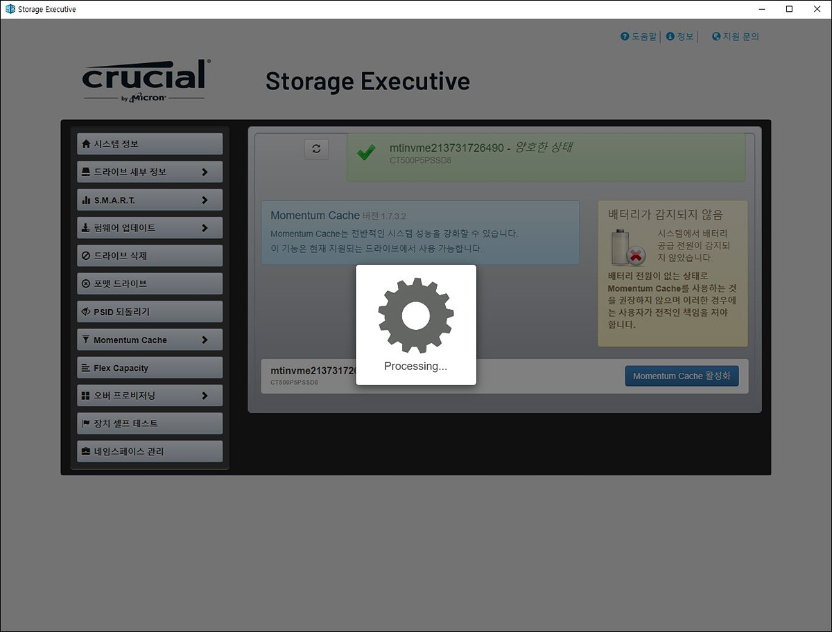마이크론 SSD를 테스트할 때마다 지적하는 부분인데 Storage Executive 왼쪽 메뉴를 이동할 때마다 딜레이가 좀 있습니다. 이 프로그램을 이용하지 않는 분들도 많고 사용하더라도 가끔씩만 사용해서 크게 문제가 되는 부분은 아니지만 그래도 경쟁사 제품의 소프트웨어를 생각해본다면 아쉬운 부분입니다.