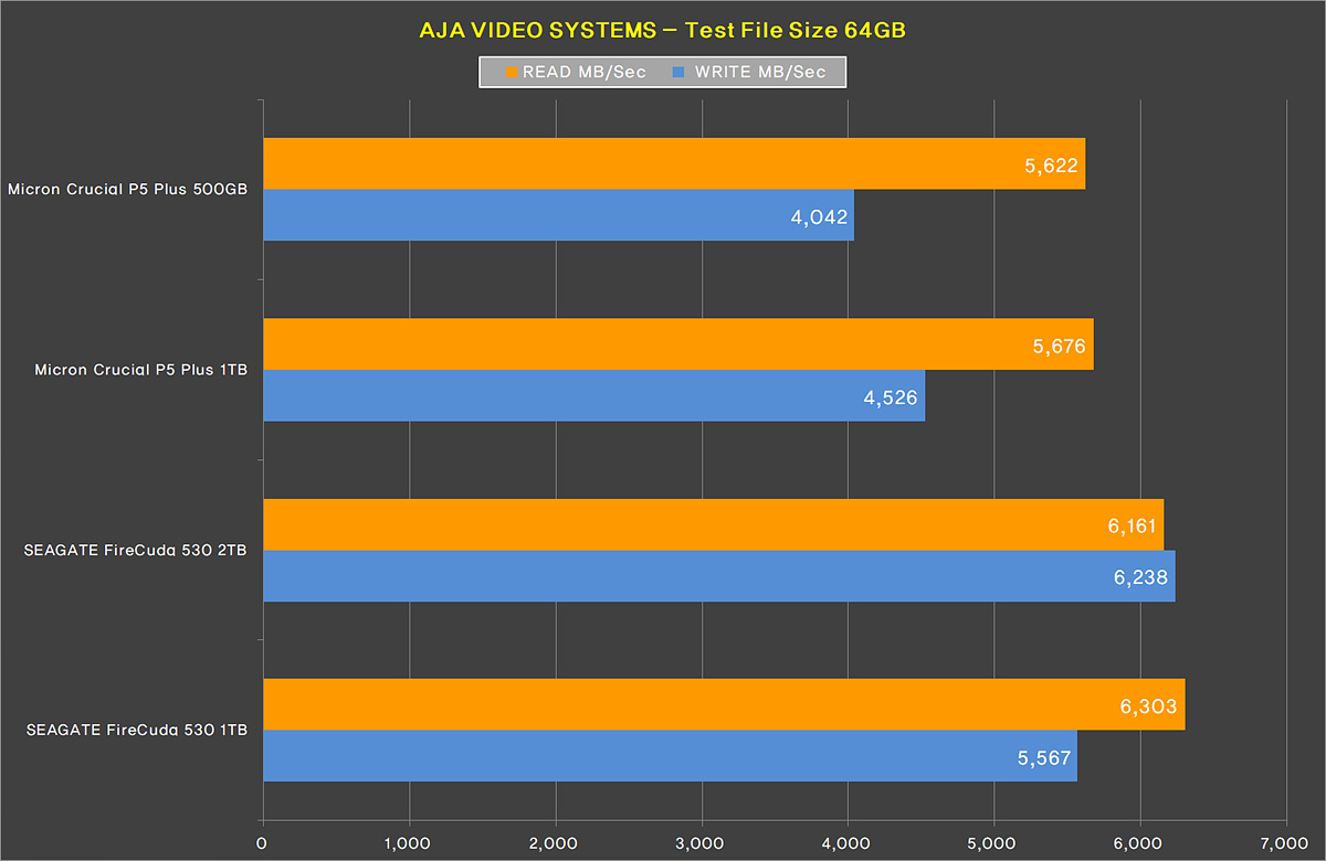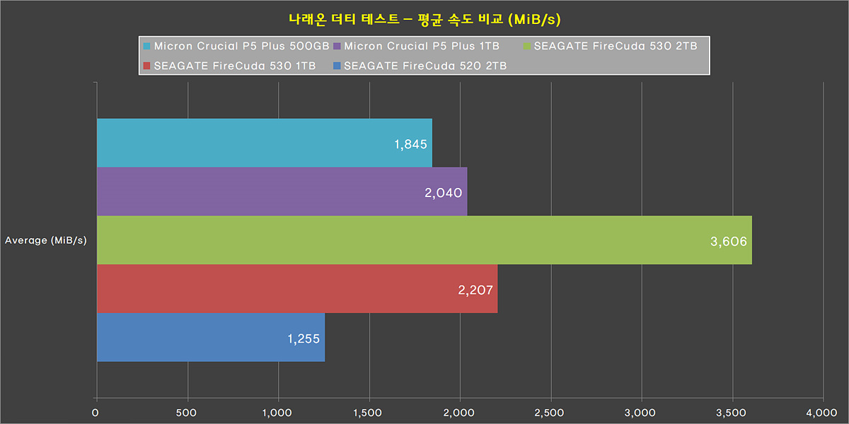 PCIe 4.0을 지원하는 제품들과의 비교 그래프입니다. 처음에 언급을 했지만 SSD는 용량이 클수록 속도 역시 조금씩 올라가게 됩니다. P5 Plus 500 SSD는 스펙보다 더 높은 성능을 보여주었습니다.