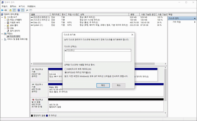 HDD, SSD와 같이 내장으로 사용하는 저장장치들은 내 컴퓨터 -> 우클릭 -> 관리 -> 저장소 -> 디스크 관리에서 새로운 볼륨을 할당해주어야 정상적으로 사용할 수 있습니다. 디스크 관리로 가면 팝업으로 MBR / GPT를 선택하라는 메시지가 나오는데 어떤 걸 선택해도 상관은 없습니다.