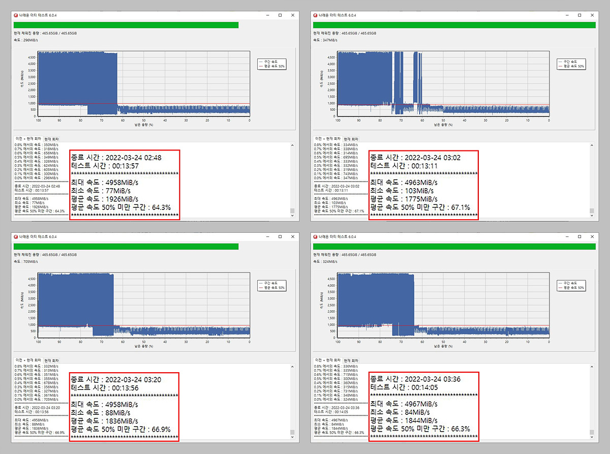 1TB 이상의 다른 SSD에 비해 캐시 메모리가 좀 적은 편이어서 그런지 하락 구간이 좀 큰 편이었습니다. (캐시 메모리 부분은 스펙에서 정확히 표기되지 않아서 확인할 수 없었습니다.)