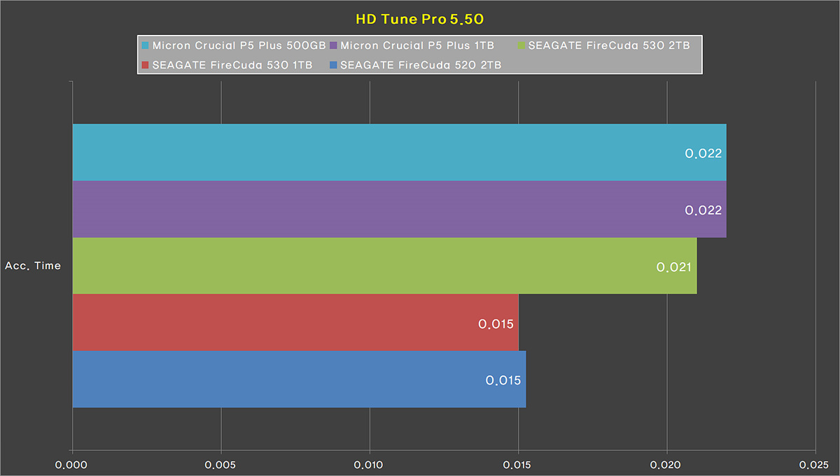 AS SSD를 4회 측정한 결괏값의 평균입니다. 마이크론 제품들이 Access Time이 조금 높은 편인데 P5 Plus에서도 비슷하게 이어졌네요. 추가로 4K를 64회 반복하는 읽기도 다른 제품들에 비해 살짝 떨어지는 모습이었습니다.