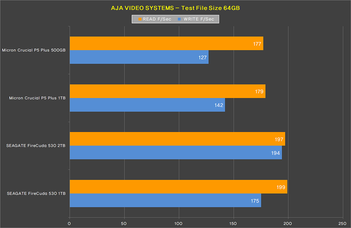 랜더링에 관련된 부분을 측정하는 AJA 벤치는 UHD / sRGB 100%를 기준으로 하였으며 1GB / 4GB / 16GB / 64GB 파일의 크기별로 각각 측정하였습니다.